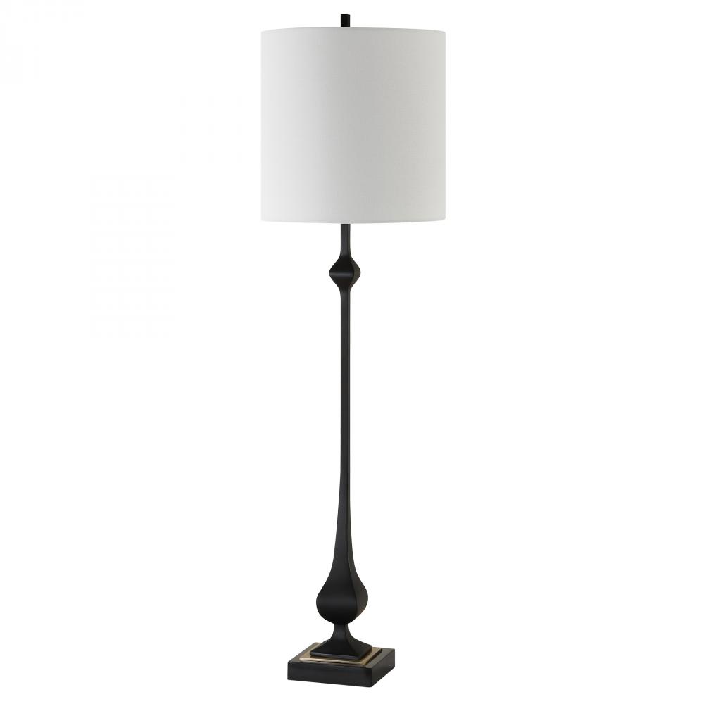 This Updated Traditional Buffet Lamp Is Finished In Satin Black With A Luxurious Velvet-like Texture That Exudes Sophistication And Contemporary Elegance, Displayed On A Sleek Black Marble Foot, Accented With Plated Antique Brass Details. The Round Hardback Drum Shade Is Covered In A Crisp White Linen Fabric.
