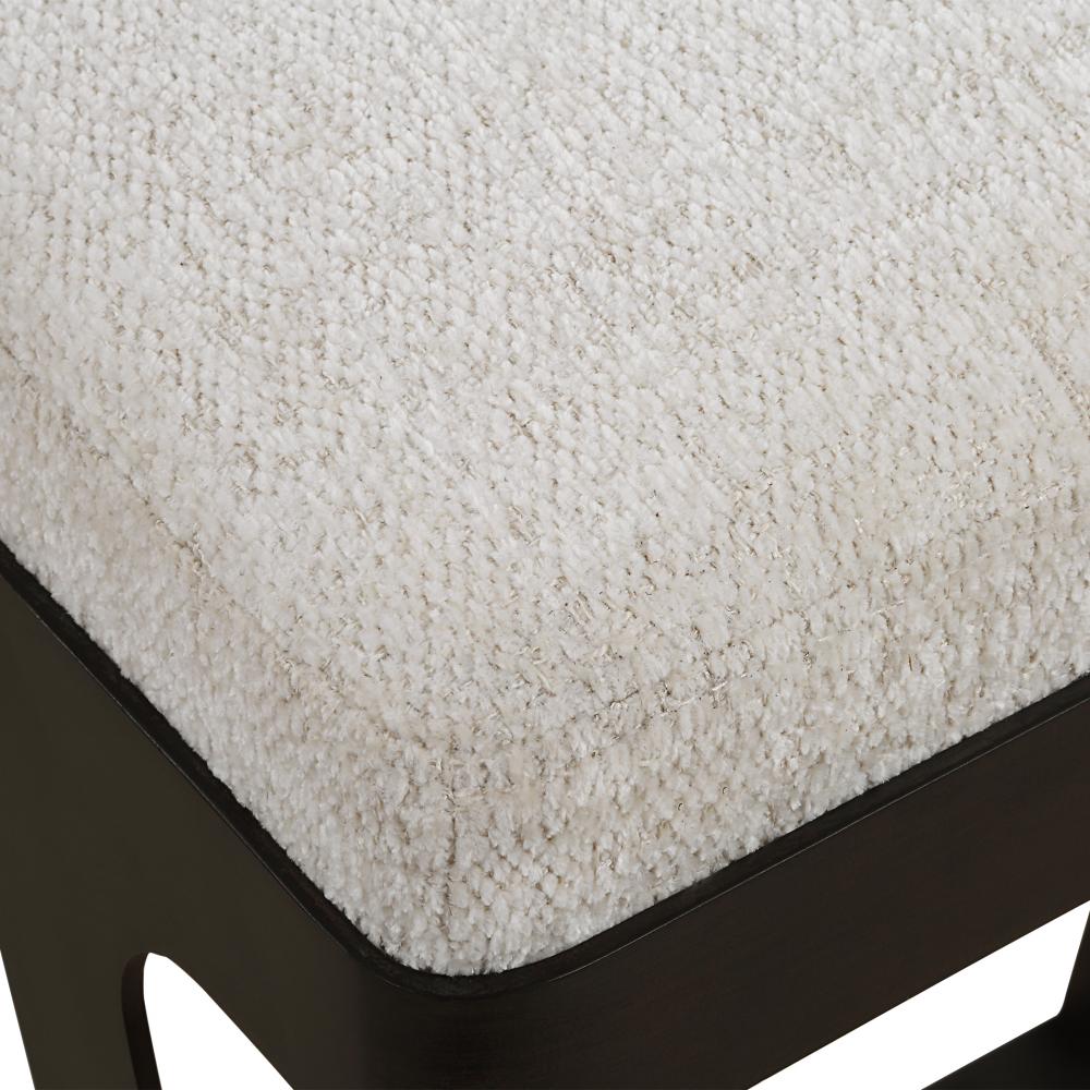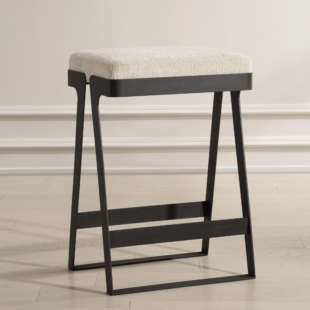 The Modern Hover Counter Stool Is Streamlined With An Aged Black Curved Iron Base And Cushioned Seat. Upholstered In An Ivory Chenille Boucle Performance Fabric.