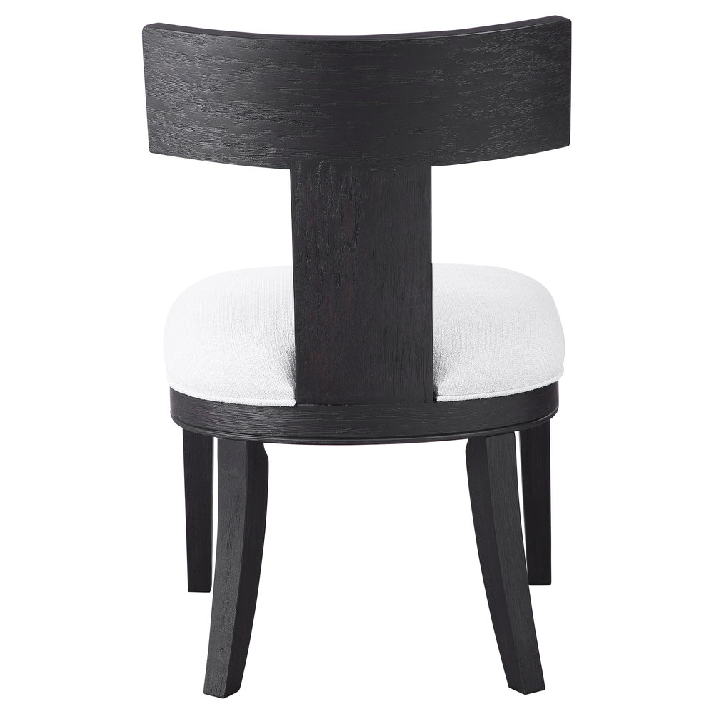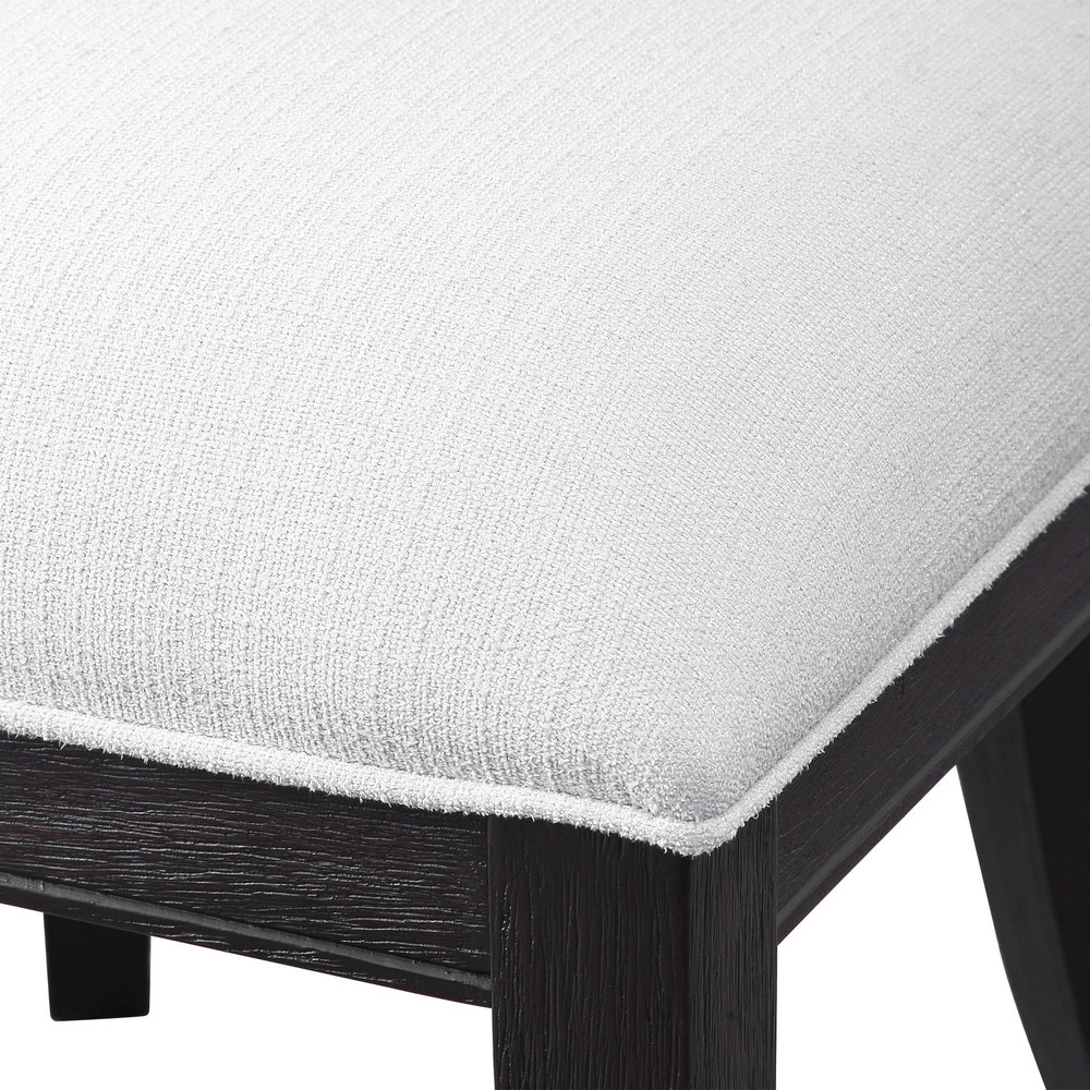 This Modern Take on A Klismos Chair Features A Curved Rubber Wood Frame That Has Been Wire Brushed and Rubbed in A Charcoal Black Stain, Paired with A White Slubbed Performance Fabric Cushion. Seat Height is 18".