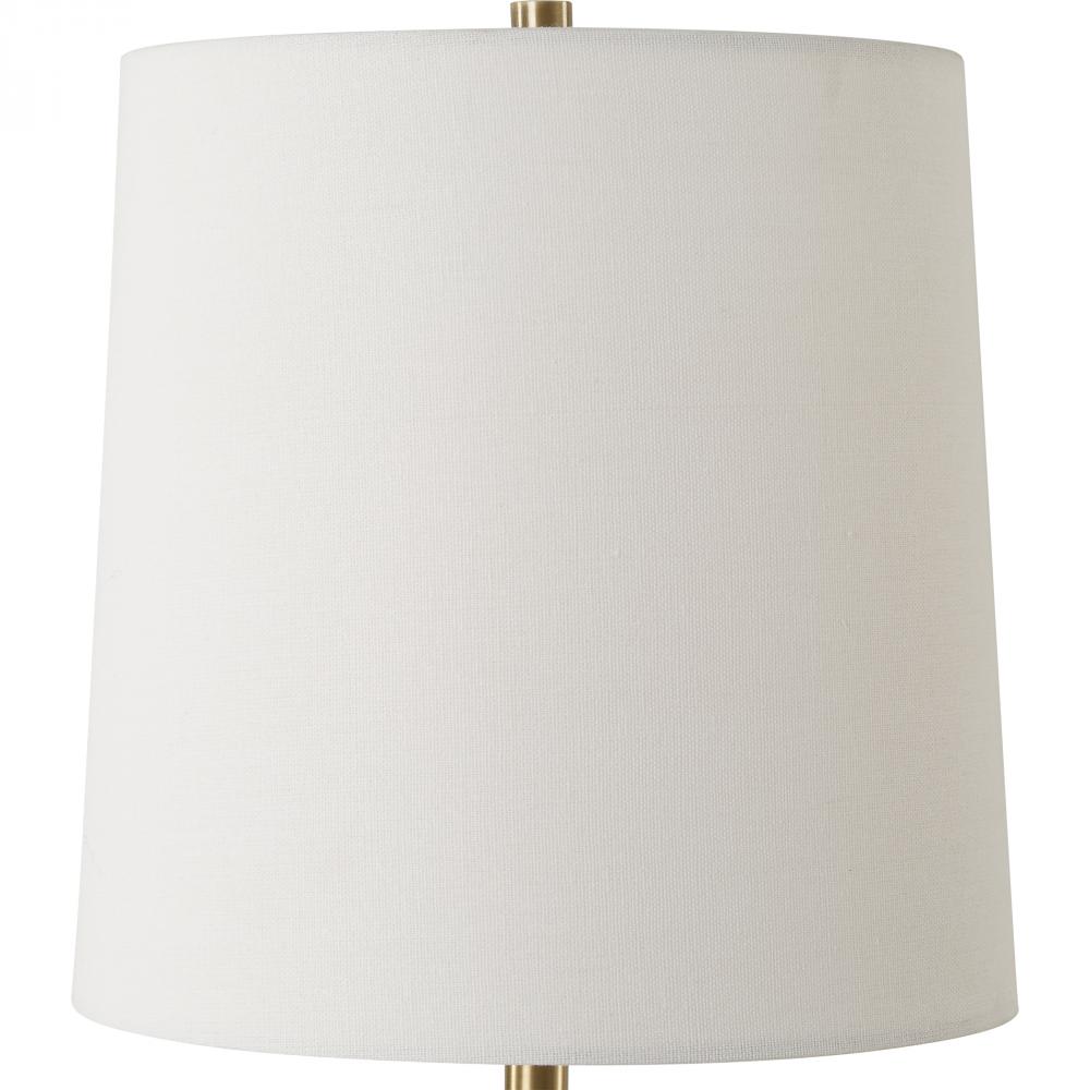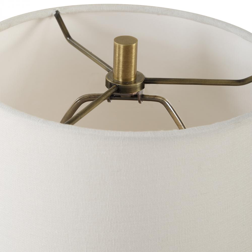 This Accent Lamp Features A Scooped Out Travertine Base Paired With Plated Antique Brass Accents. The Slightly Tapered Round Hardback Shade Is Covered In White Linen Fabric.