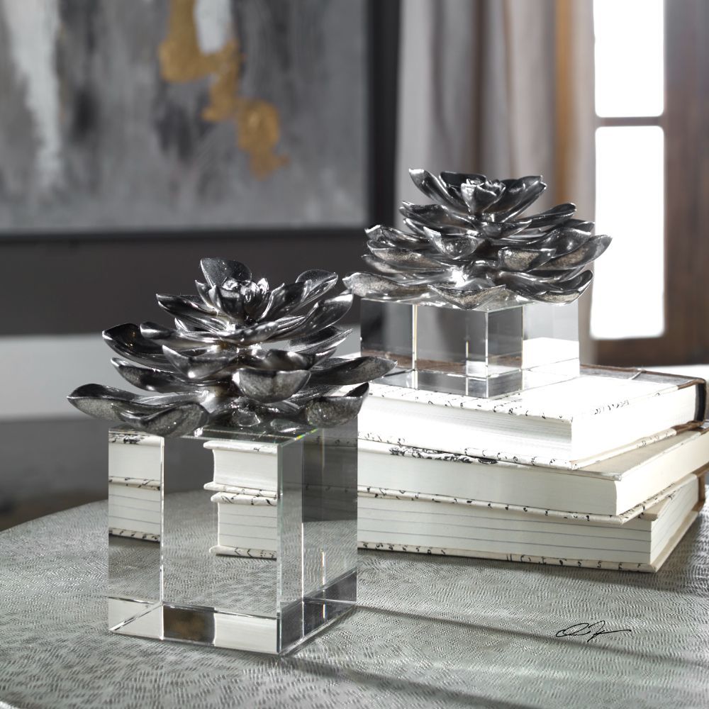 Simple Elegance is Achieved By These Antiqued, Metallic Silver Lotus Blooms That Appear to Be Floating on Clear Crystal Cubes. Sizes: S-6x5x6, L-6x7x6