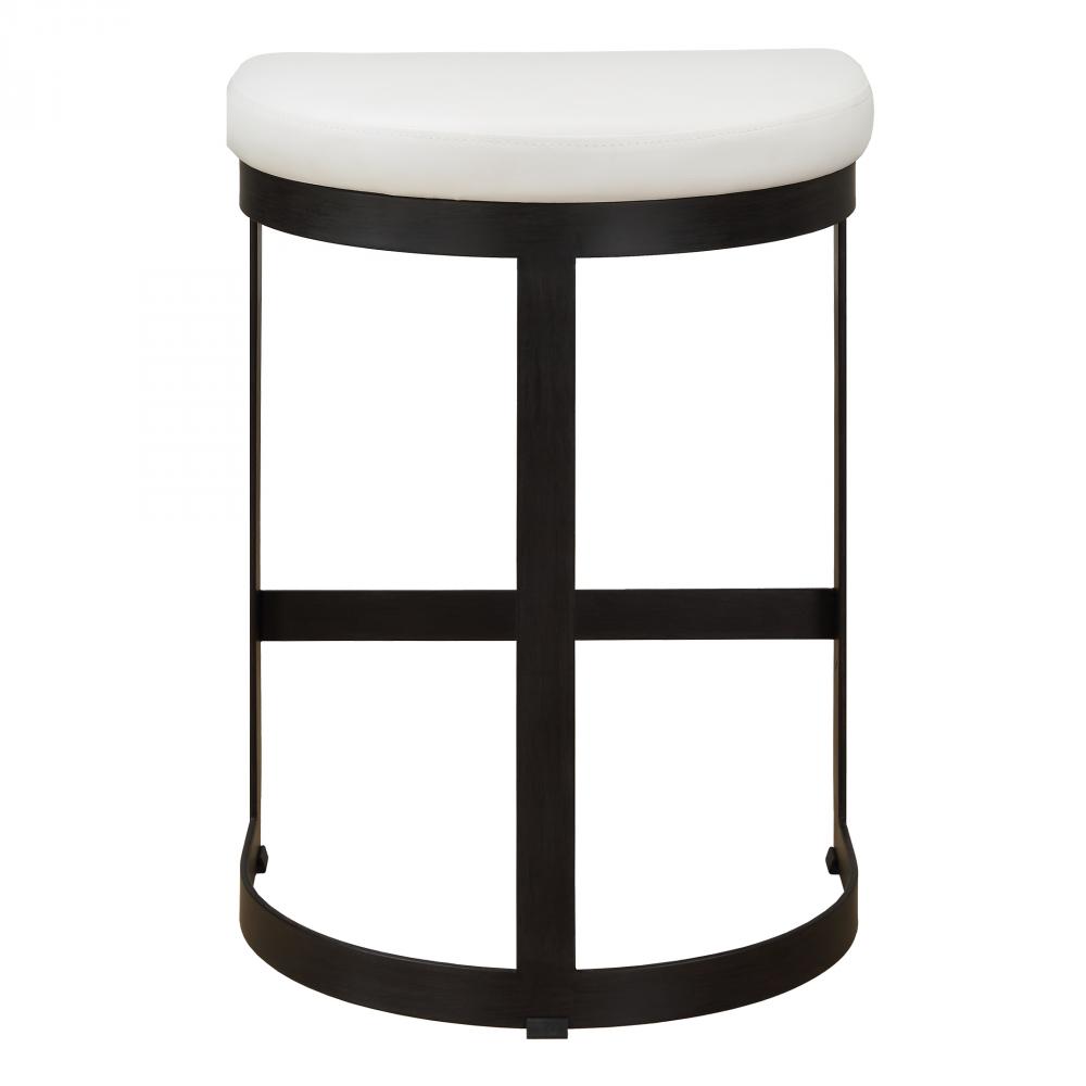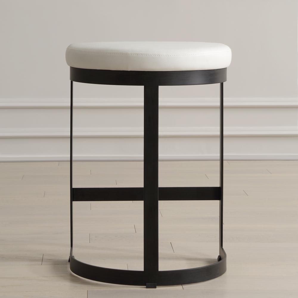 Simplistic But Sturdy, This Statement Counter Stool Features A Thick Hand Forged Iron Base Finished In Matte Black. Plush Seat Is Tailored In A White Pebbled Faux Leather. Seat Height Is 26".