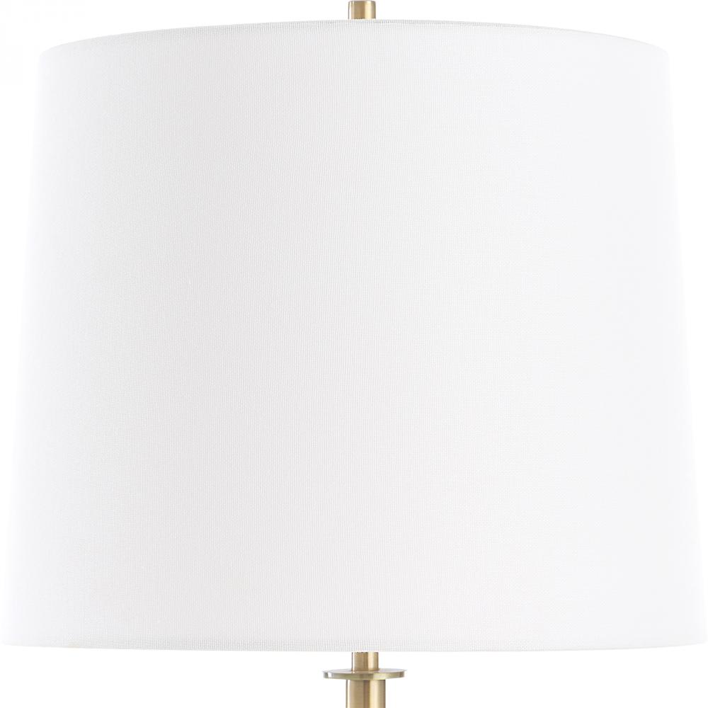 The Jenson Buffet Lamp Showcases A Striking Black Marble Base With Contrasting Brown And White Veining, Complimented With A Plated Brushed Brass Base. The Slightly Tapered Round Hardback Shade Is A Crisp White Linen Fabric.