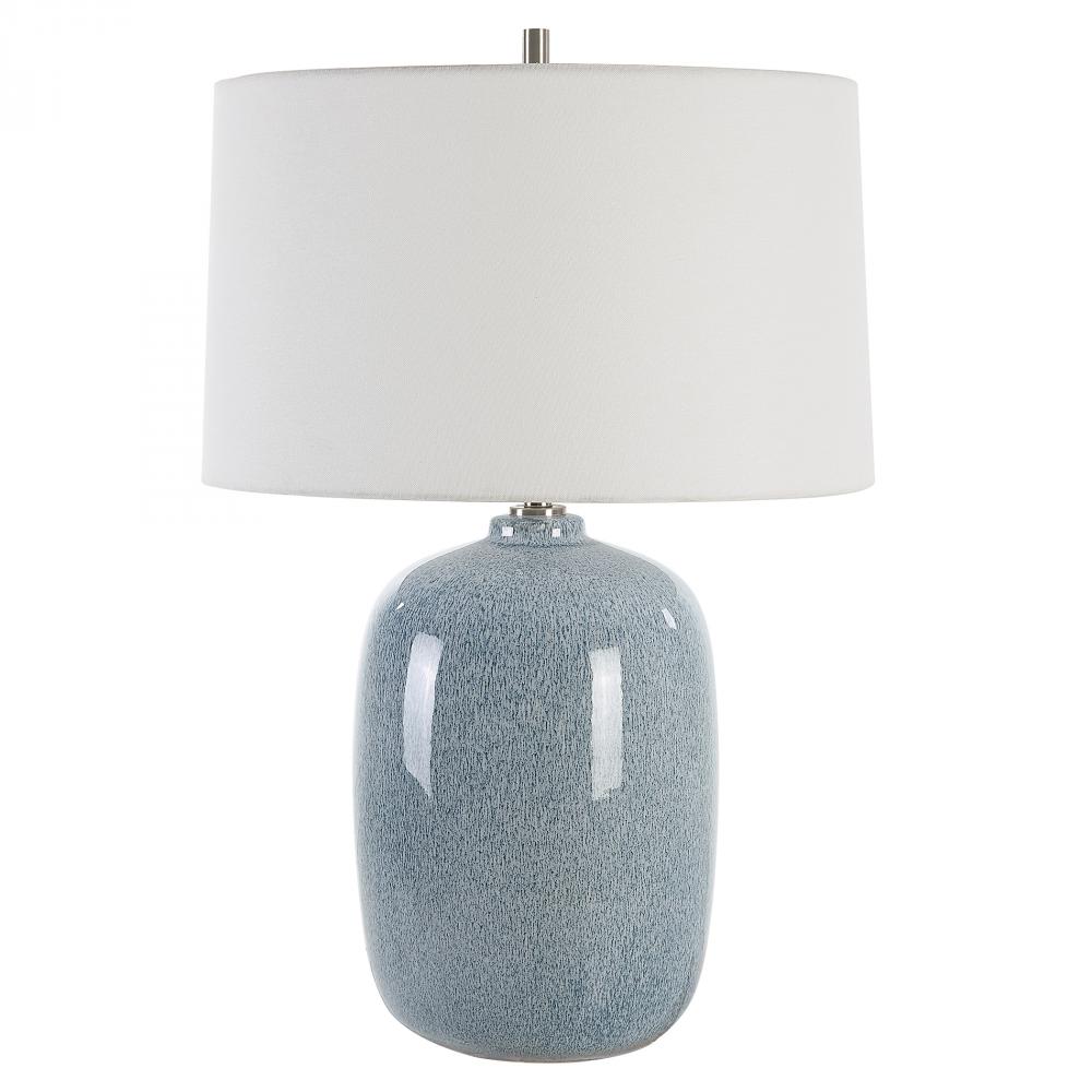 This Ceramic Table Lamp Features A Peaceful Sky Blue Glaze with Cobalt Mottled Details Paired with Plated Brushed Nickel Accents. The Round Hardback Shade is Covered in A Crisp White Linen Fabric. Due to The Nature of Fired Glazes on Ceramic Lamps, Finishes Will Vary Slightly.