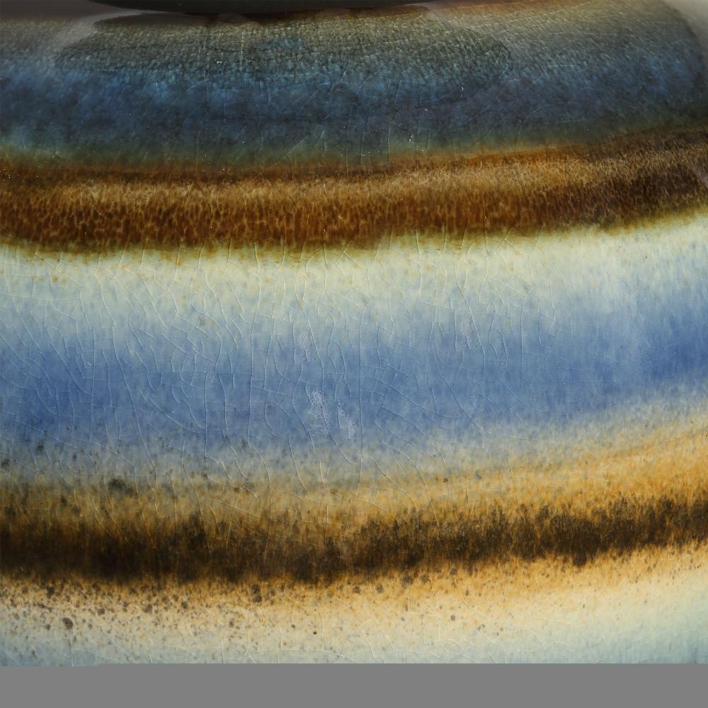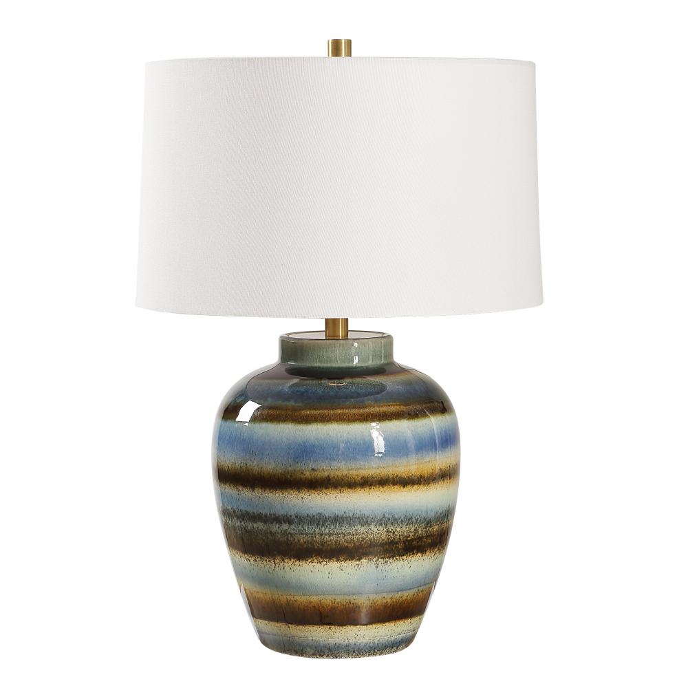 The Judarn Table Lamp Features A Distinctive Artisan-crafted Aesthetic, Blending Earthy Shades Of Blue, And Rust Brown Glazes Over A Timeless Urn Shape Ceramic Base, Accented With Plated Antique Brass Details. The Slightly Tapered Hardback Shade Is Covered In A White Linen Fabric. Due To The Nature Of Fired Glazes On Ceramic Lamps, Finishes Will Vary Slightly.