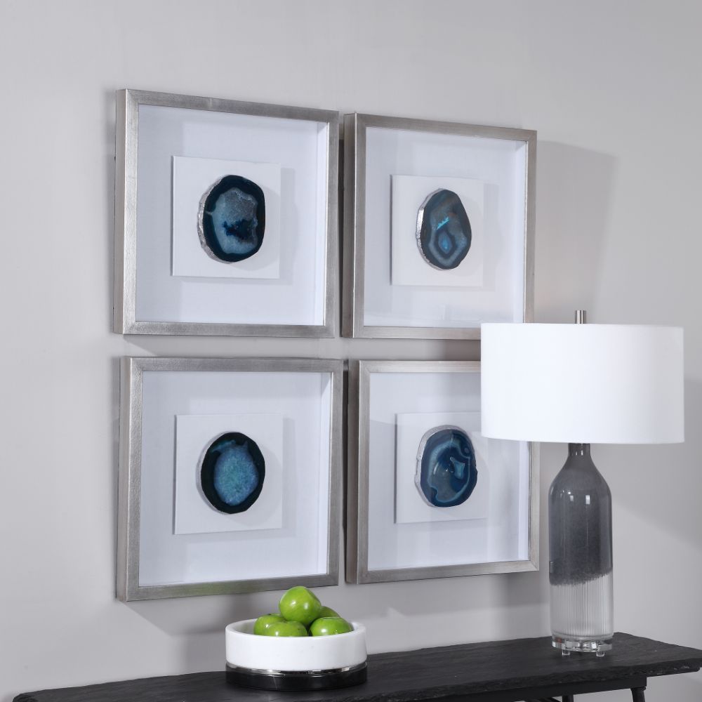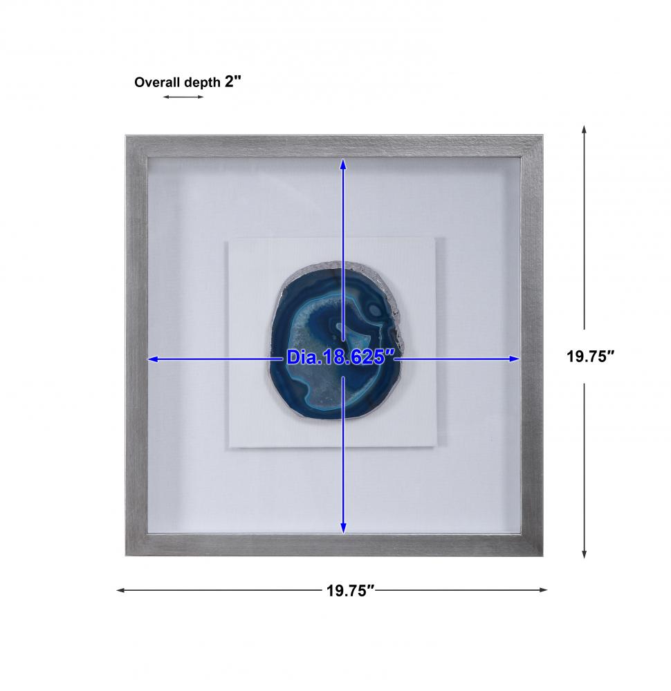 A Pine Wood Shadow Box Featuring A Hand Applied Silver Leaf Finish Showcases A Striking Blue Agate Stone with Light Blue Veining, Accented with Hand Painted Silver Edging. Mounted on A White Linen Backing.