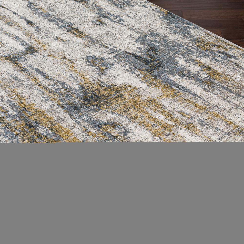 This Machine Woven Rug Features An Abstract Design in Tones of Light Beige, Cream, Denim Blue, and Gray, Constructed From Lustrous Polyester.