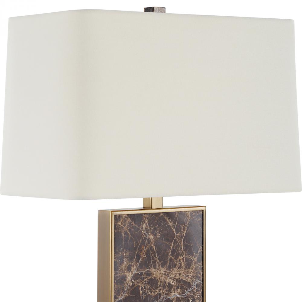The Lafferty Table Lamp Showcases A Emperador Dark Brown Marble Slab Encased In A Plated Brass Frame, Accented With Matching Details. The Slightly Tapered Rectangular Hardback Shade Is An Off-white Linen Fabric With Soft Curved Corners.