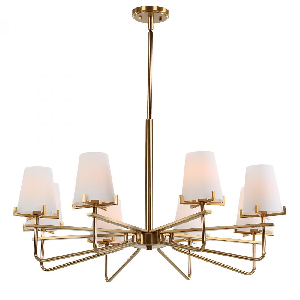 Modern Beauty with Graceful Accent Lines in A Warm Brass Finish. Arms Are Topped with Matte Opal Glass Cone Shaped Shades Giving Us A Spectacular Transitional Chandelier. 8-60 Watt Max Candelabra Sockets. Bulbs Not Included. Supplied with 20' Wire, 3-12" Stems and 1-6" Stem for Adjustable Installation.