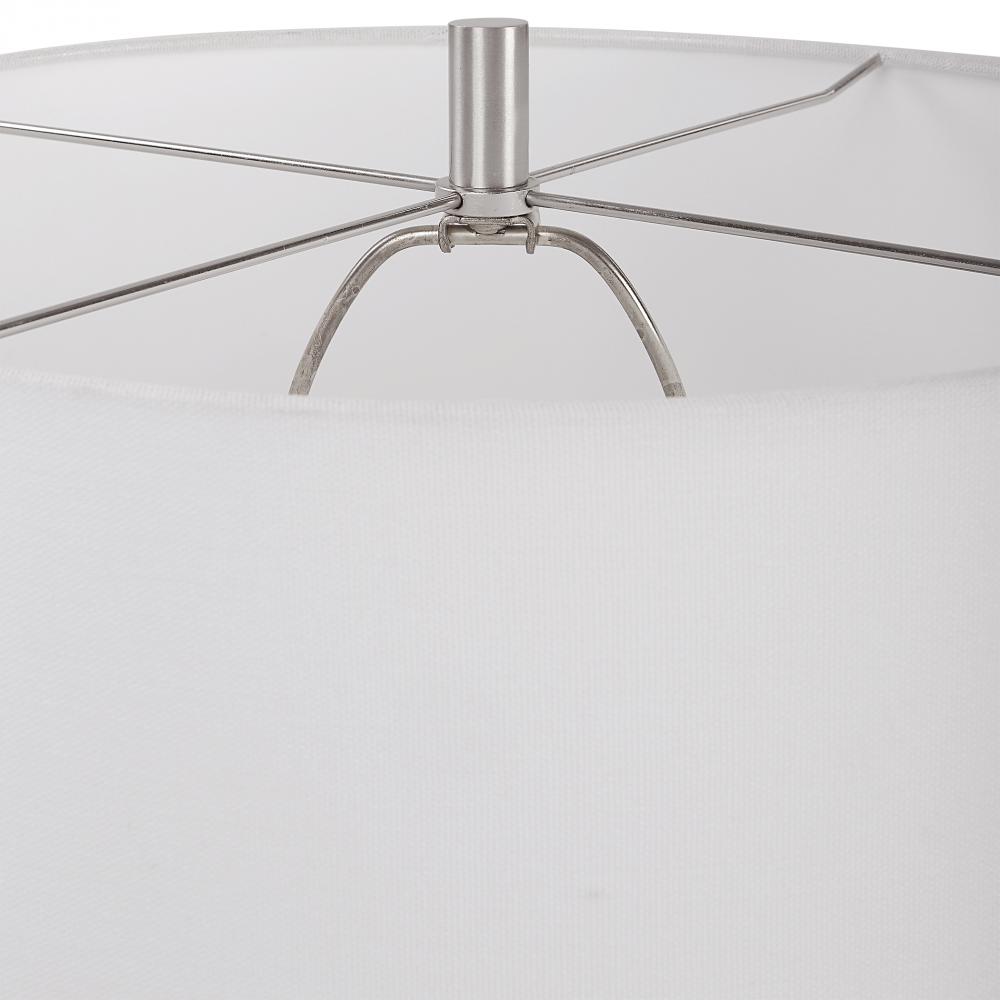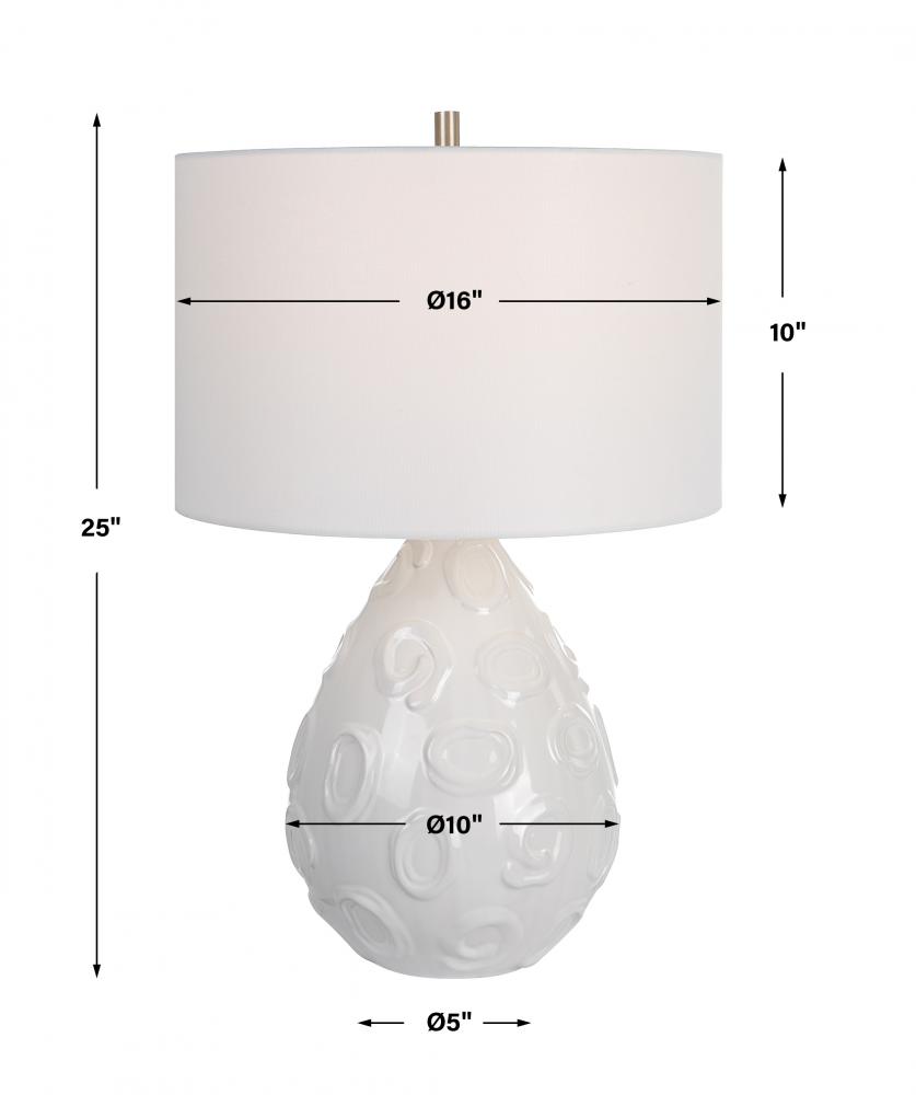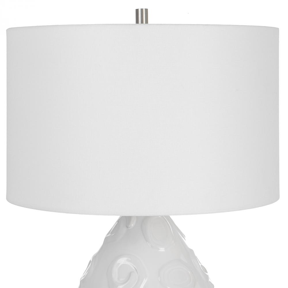 Handcrafted From Ceramic, This Table Lamp Features A Clean White Glaze with Individually Applied Whimsical Loop Details, and Plated Brushed Nickel Accents. The Hardback Drum Shade is Covered in A White Linen Fabric.