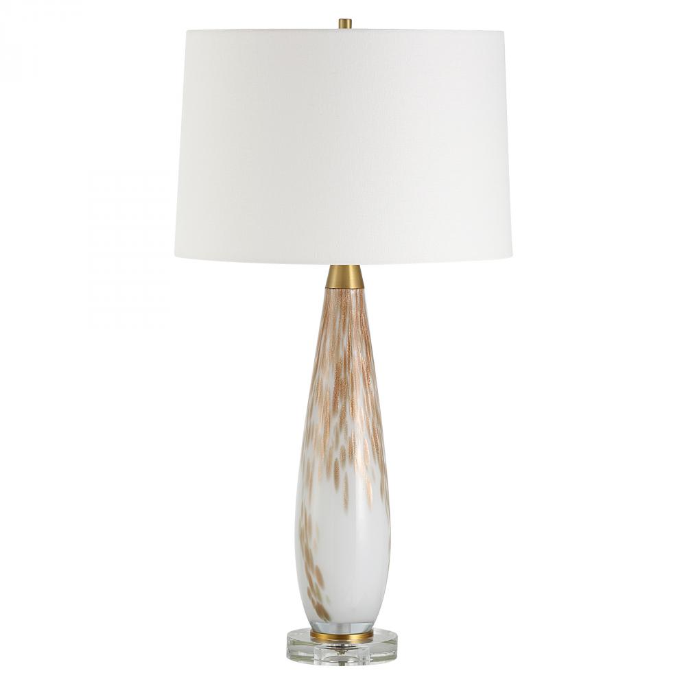 This Sleek and Slender Glass Base Features A Brilliant White Background with Spotted Metallic Gold Detailing Displayed on A Thick Crystal Foot and Paired with Plated Brushed Brass Accents. The Slightly Tapered Round Hardback Shade is Covered in A Crispy White Linen Fabric.