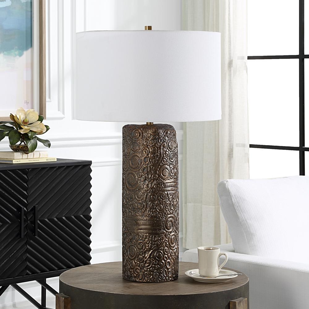 Transform Your Space With The Charm Of Nostalgia Embodied In Our Ceramic Table Lamp. Its Whimsical Carvings And Asymmetrical Column Shape Evoke The Essence Of A Cherished Found Object. Finished In A Distressed Aged Bronze And Accented With Plated Brass Details, It Exudes Timeless Elegance With A Touch Of Vintage Allure. The Round Hardback Drum Shade Is A Crisp White Linen Fabric.