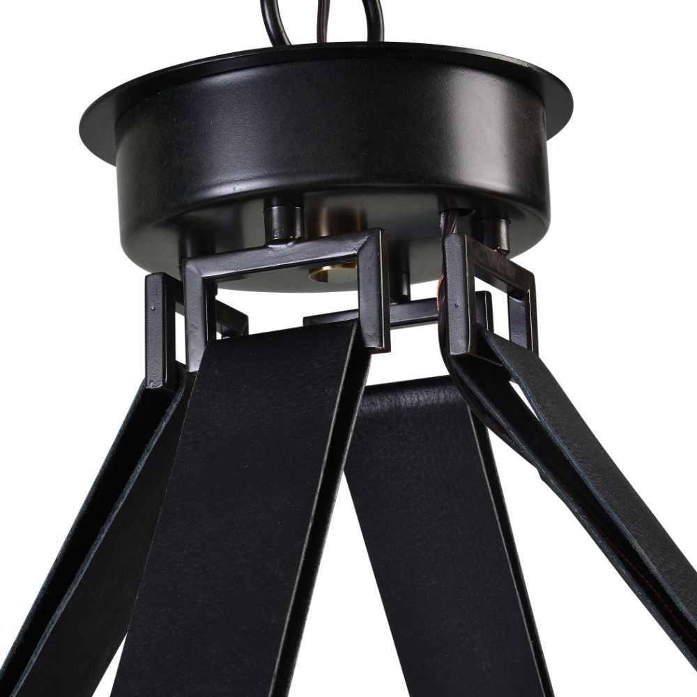Combination of Dark Antique Bronze and Weathered Bronze with Leather Straps Featuring A Large Circle Body and 8" Oversized Canopy. 12-60 Watt Max Edison Sockets. Bulbs Not Included. Supplied with 20' Wire and 7' Chain for Adjustable Installation.