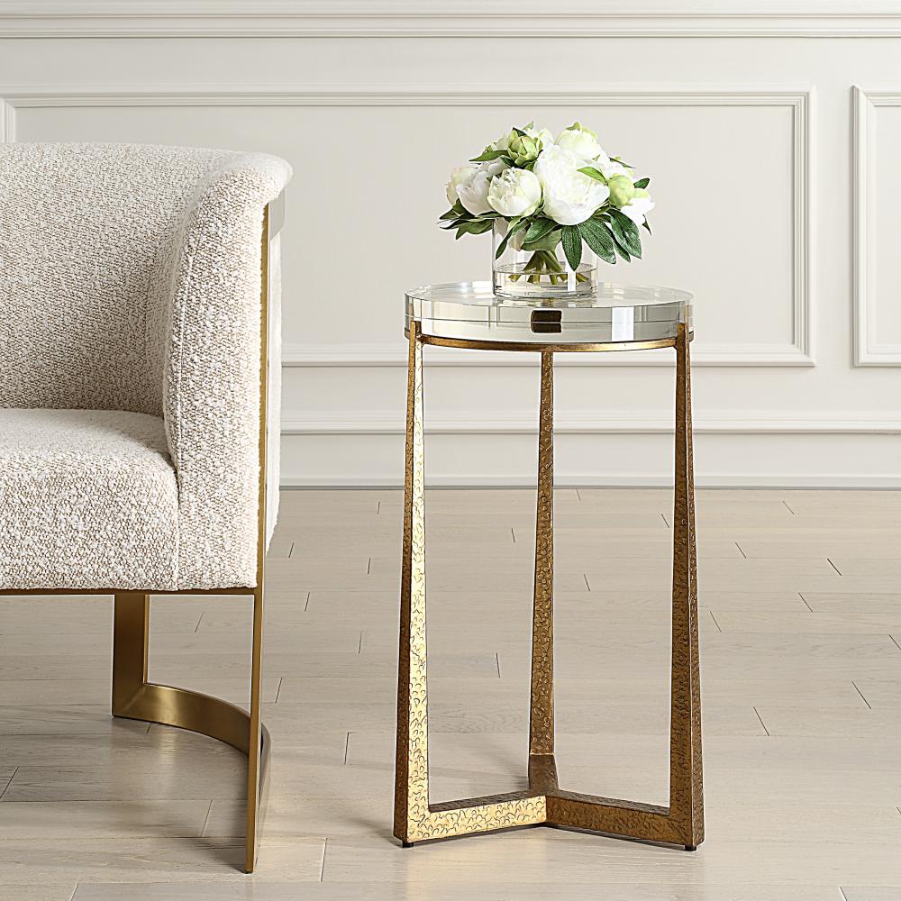 This Elegant Accent Table Adds A Touch Of Luxury To Any Room. The Textured Antique Gold Finished Iron Legs Perfectly Support And Accentuate The Thick Round Crystal Top.