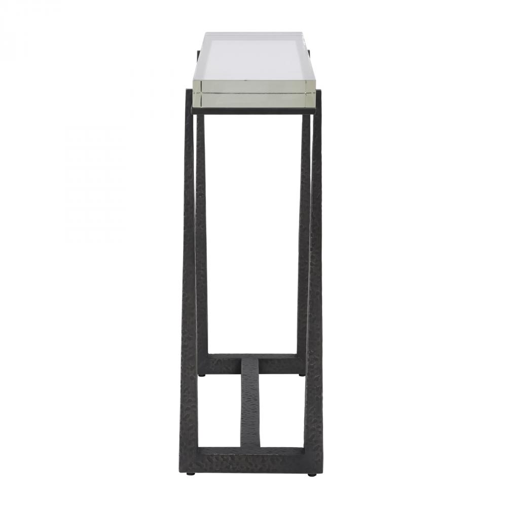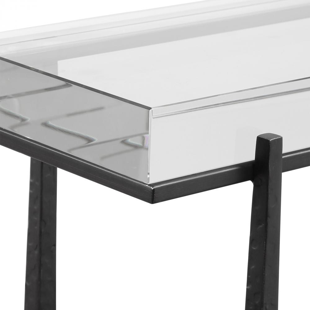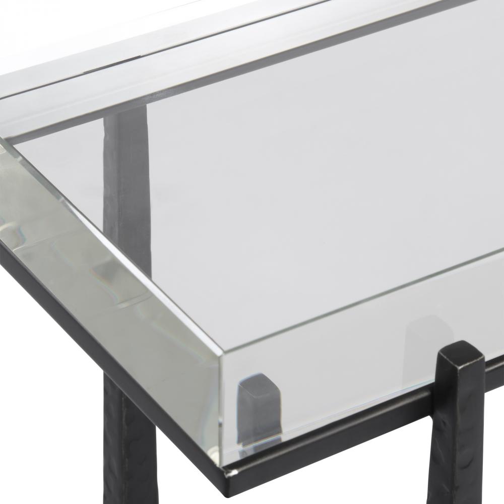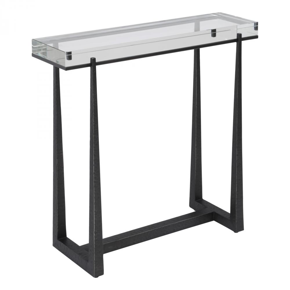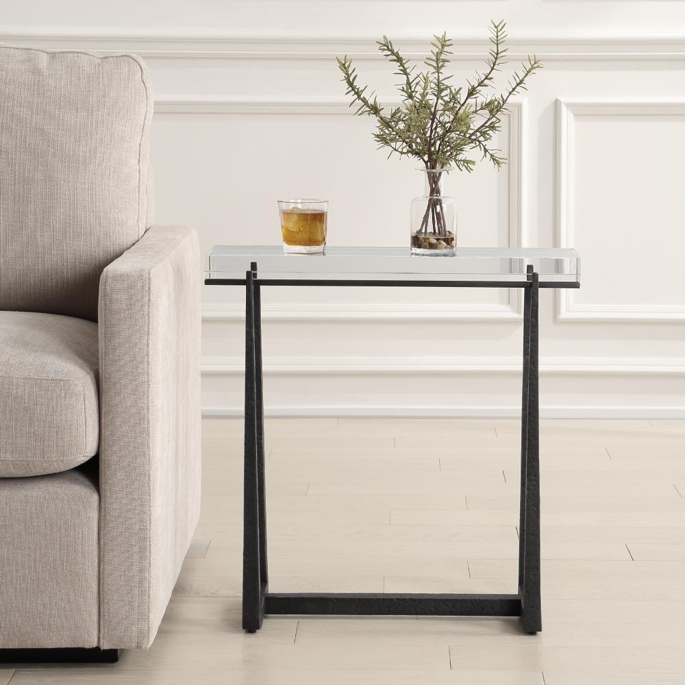 This Elegant Accent Table Adds A Touch Of Luxury To Any Room. The Textured Dark Bronze Finished Iron Legs Perfectly Support And Accentuate The Thick Crystal Top.