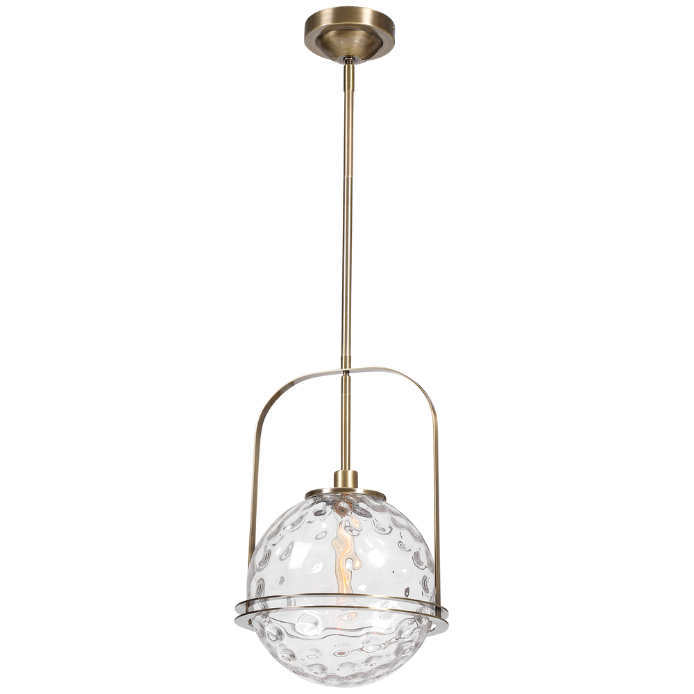 Soft Contemporary Lines Anchor This Oversized Floating Sphere of Clear Watered Glass Enhanced with Rich Antique Brass Accents Giving A Nod to Modern Design Lines Also. 1-40 Watt Max Edison Socket. Bulb Not Included. Supplied with 15' Wire, 3-12" Stems and 1-6" Stem for Adjustable Installation.