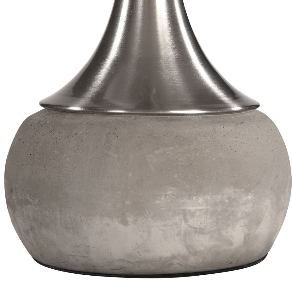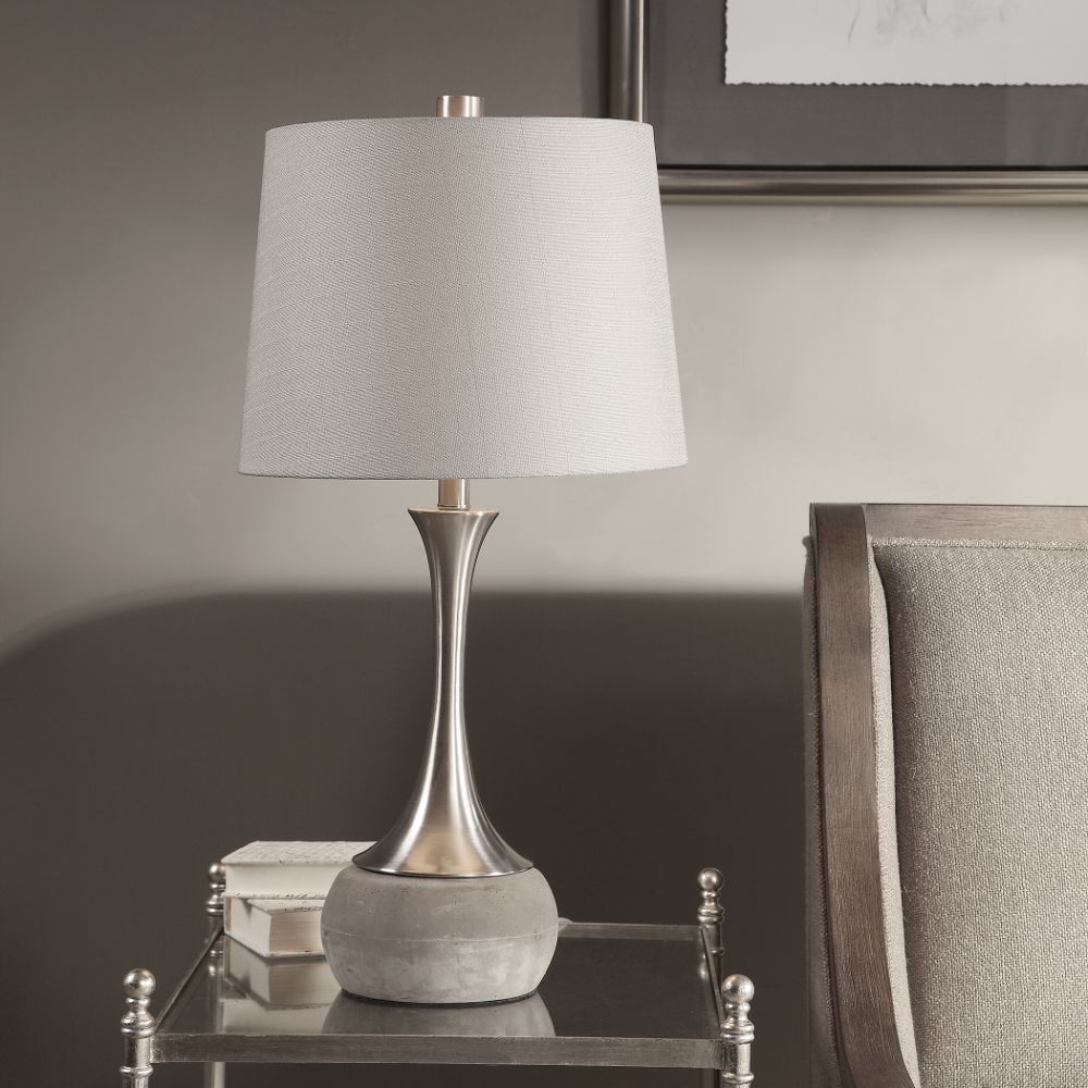 This Sleek Spun Metal Base Features A Plated Brushed Nickel Finish, Displayed on A Smoothed Natural Concrete Foot. The Tapered Round Hardback Shade is A Light Gray, Coarse Weave Linen Fabric.