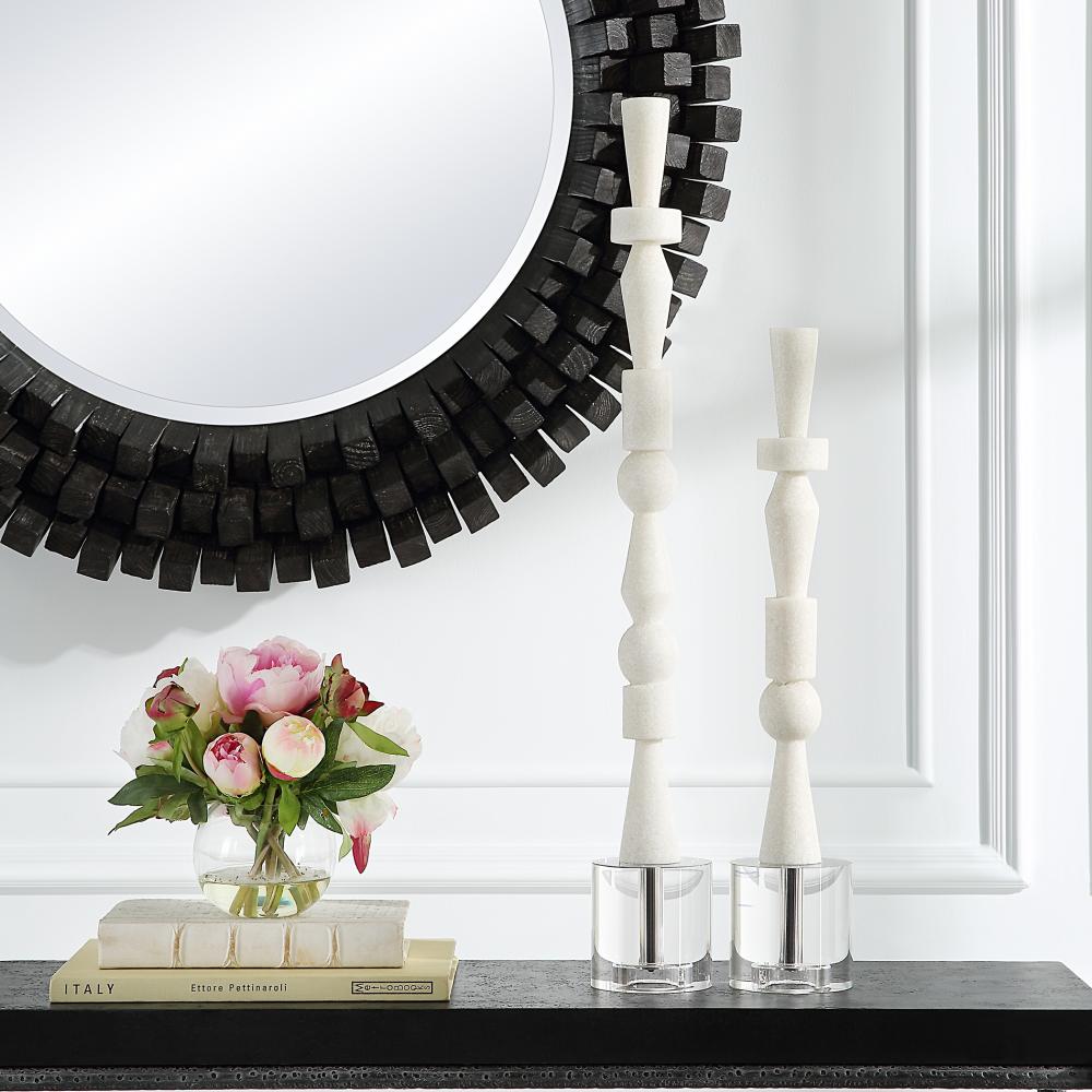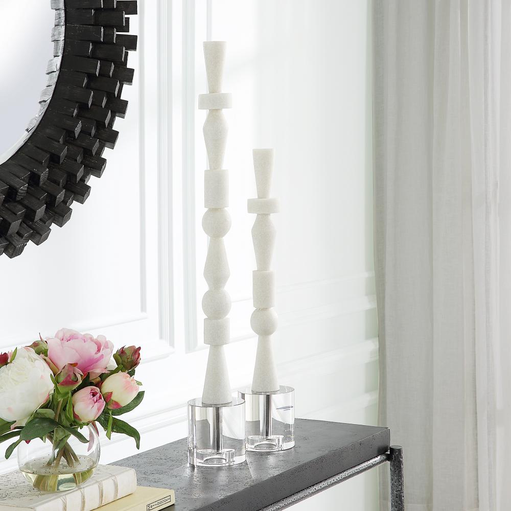 Geometric, Stacked Totems Crafted From Ivory Man-made Stone That Accurately Replicates The Look of Thassos Marble and is Accented By An Elegant Crystal Foot. Sizes: S-4x21x4, L-4x28x4
