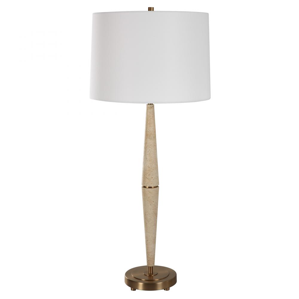This Table Lamp Combines Modern Silhouette with Organic Textures and Materials Featuring Two Cone Shaped Pieces of Light Beige Travertine Separated By Iron Details Finished in Plated Brushed Brass. The Slightly Tapered Round Hardback Shade is Covered in White Linen Fabric.