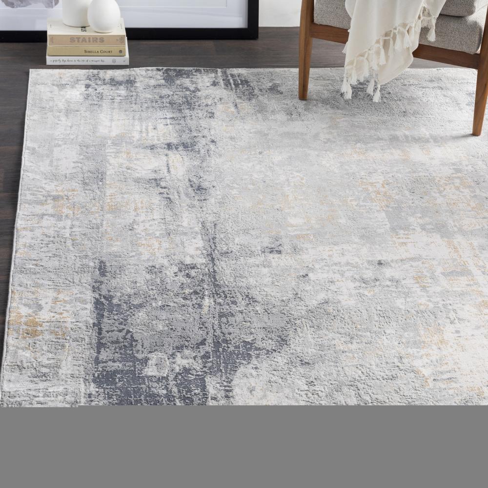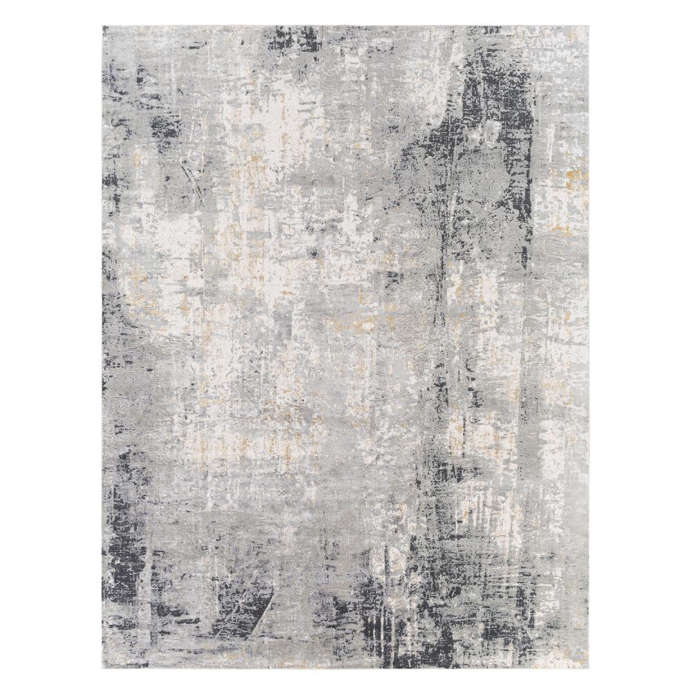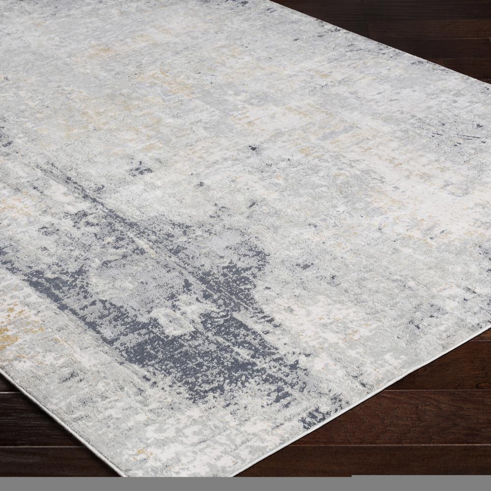 This Machine Woven Rug Features An Abstract Design in Tones of Light Gray, Off-white, Charcoal and Subtle Tones of Mustard, Constructed From A Mix of Lustrous Viscose and Polyester.