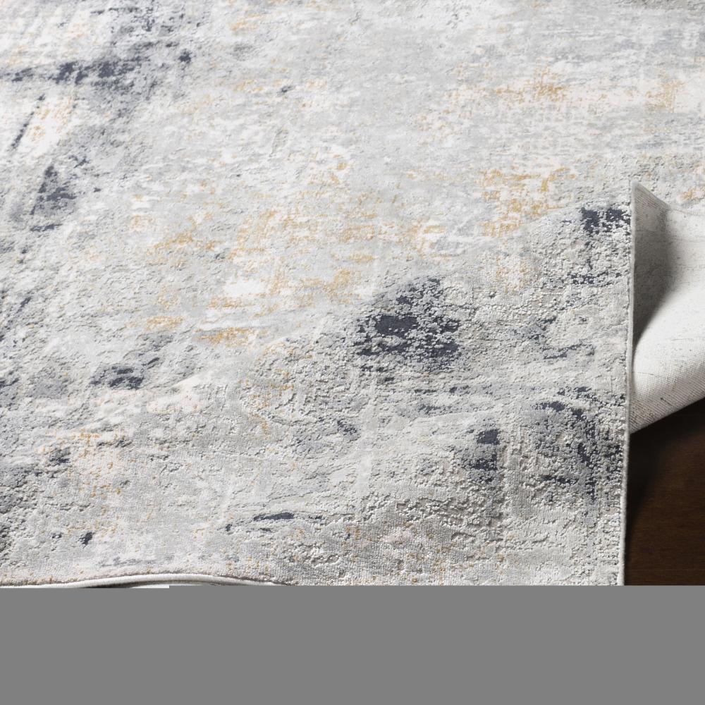This Machine Woven Rug Features An Abstract Design in Tones of Light Gray, Off-white, Charcoal and Subtle Tones of Mustard, Constructed From A Mix of Lustrous Viscose and Polyester.