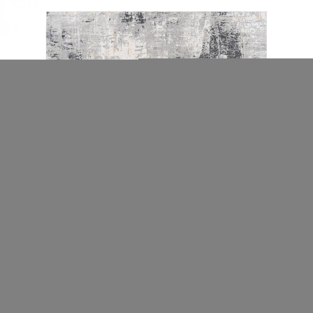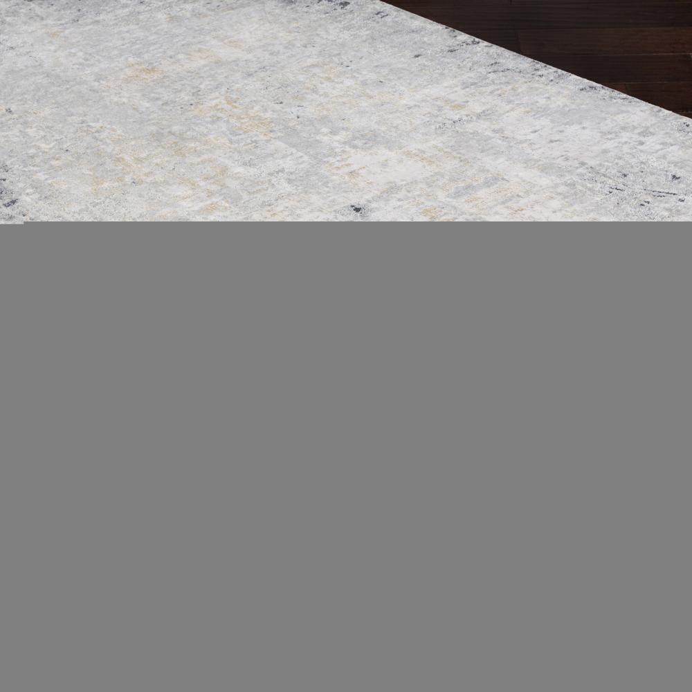 This Machine Woven Rug Features An Abstract Design in Tones of Light Gray, Off-white, Charcoal and Subtle Tones of Mustard, Constructed From A Mix of Lustrous Viscose and Polyester.
