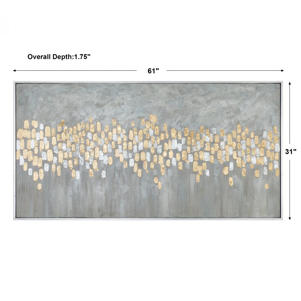 This Hand Painted Artwork on Canvas Emanates Contemporary Style, with A Modern Edge. A Textured, Gray, and Taupe Background is Accented By Bright, Metallic Gold and Silver Leaf Raised Bars. The Eye-catching Abstract is Stretched and Applied to A Wooden Frame. A Petite, Silver Leaf Gallery Frame Completes The Piece. Due to The Handcrafted Nature of This Artwork, Each Piece May Have Subtle Differences.