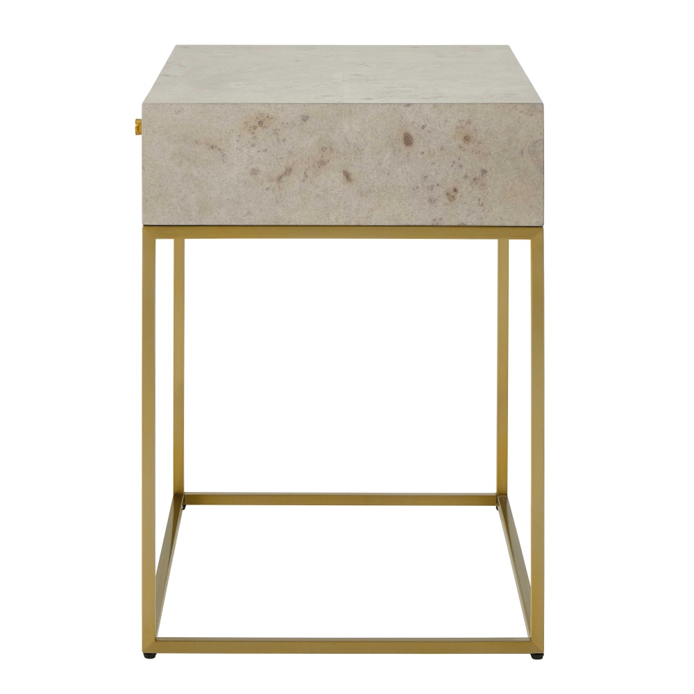 The Pembrook Side Table Embodies Modern Sophistication With Its Light Washed Maple Burl Veneer, Perched Atop A Sleek Steel Base Finished In Plated Brushed Brass With A Coordinating Drawer Pull.