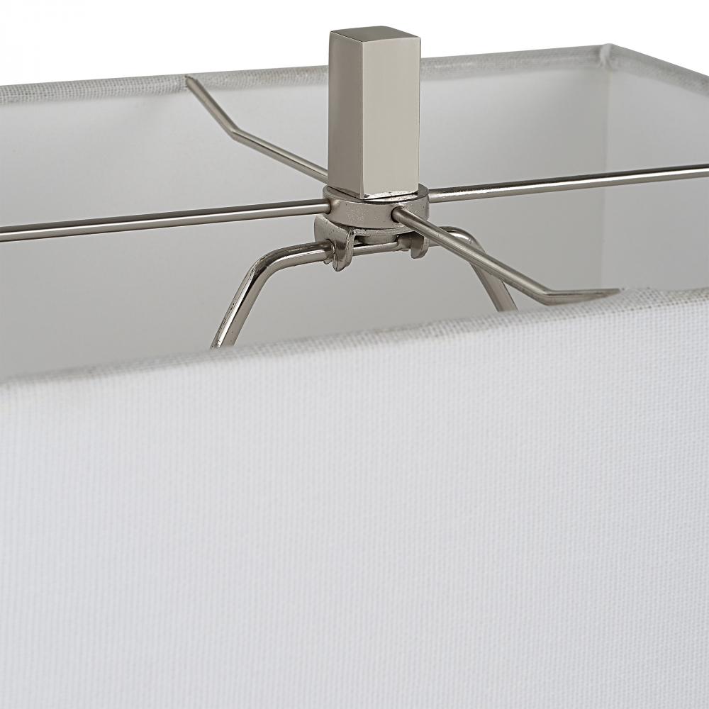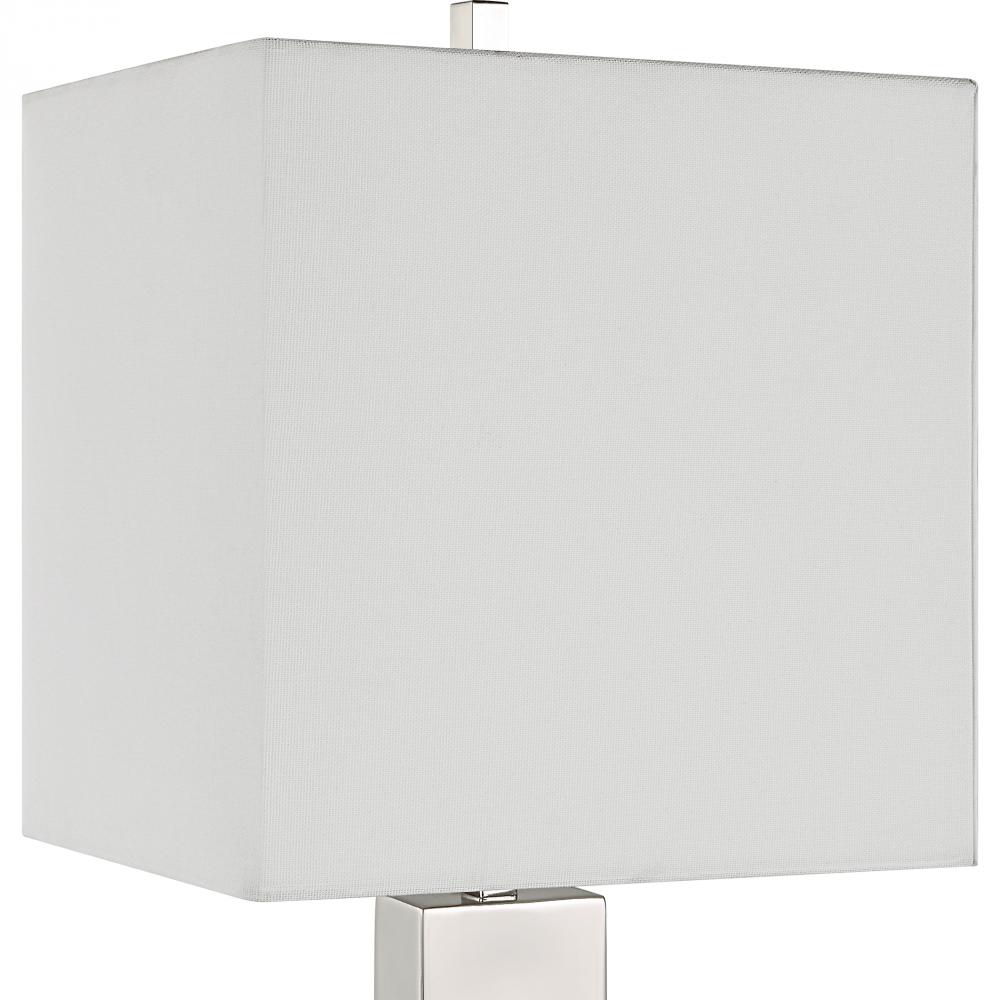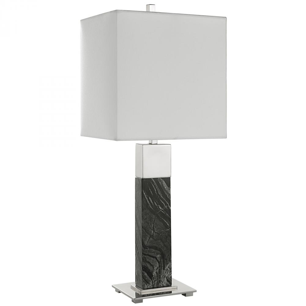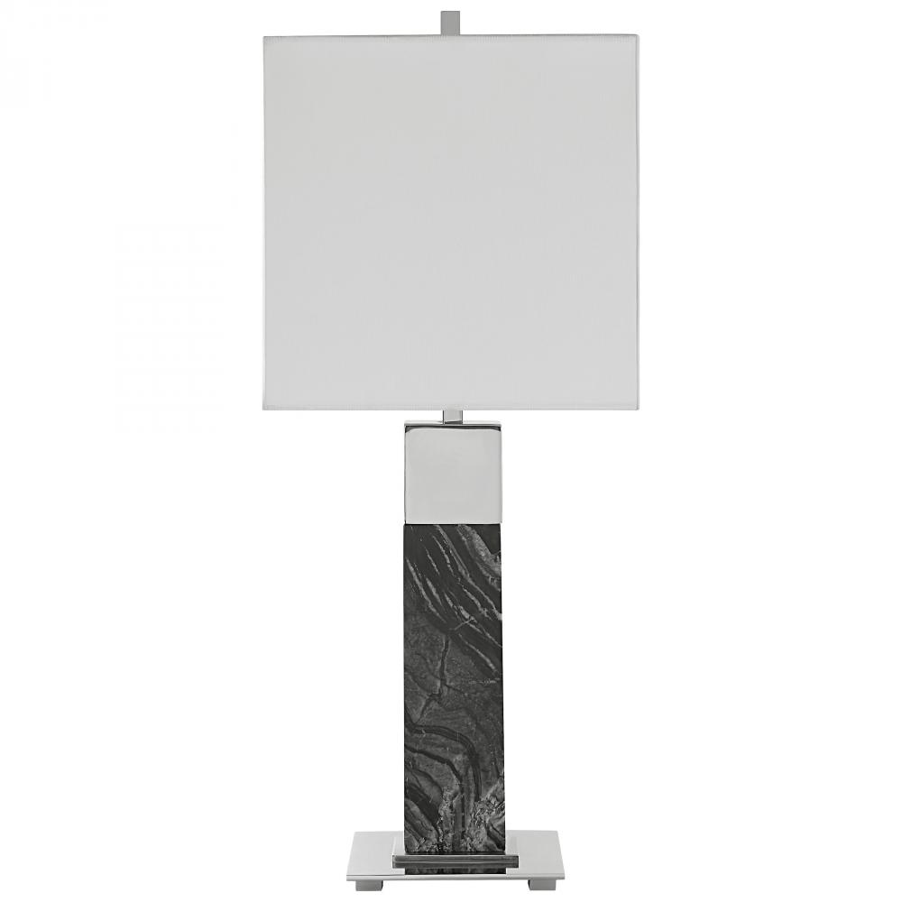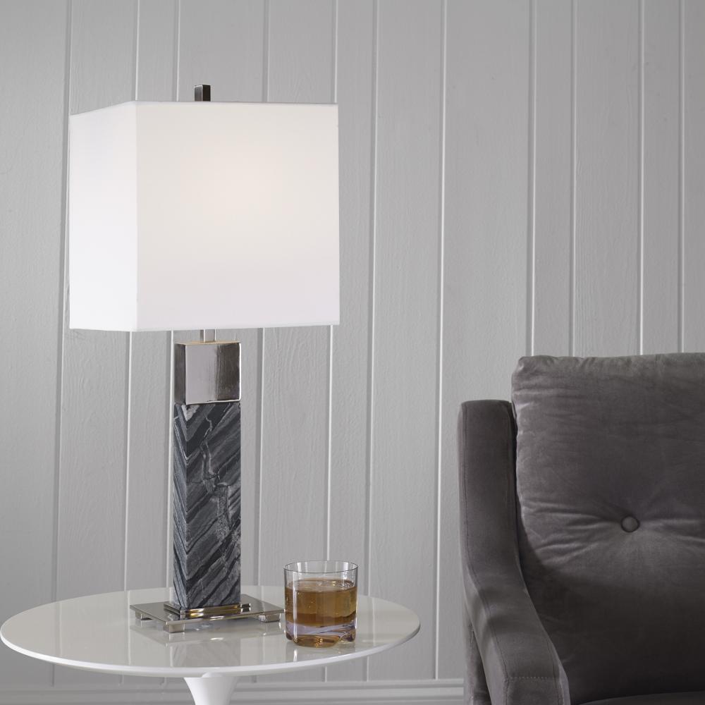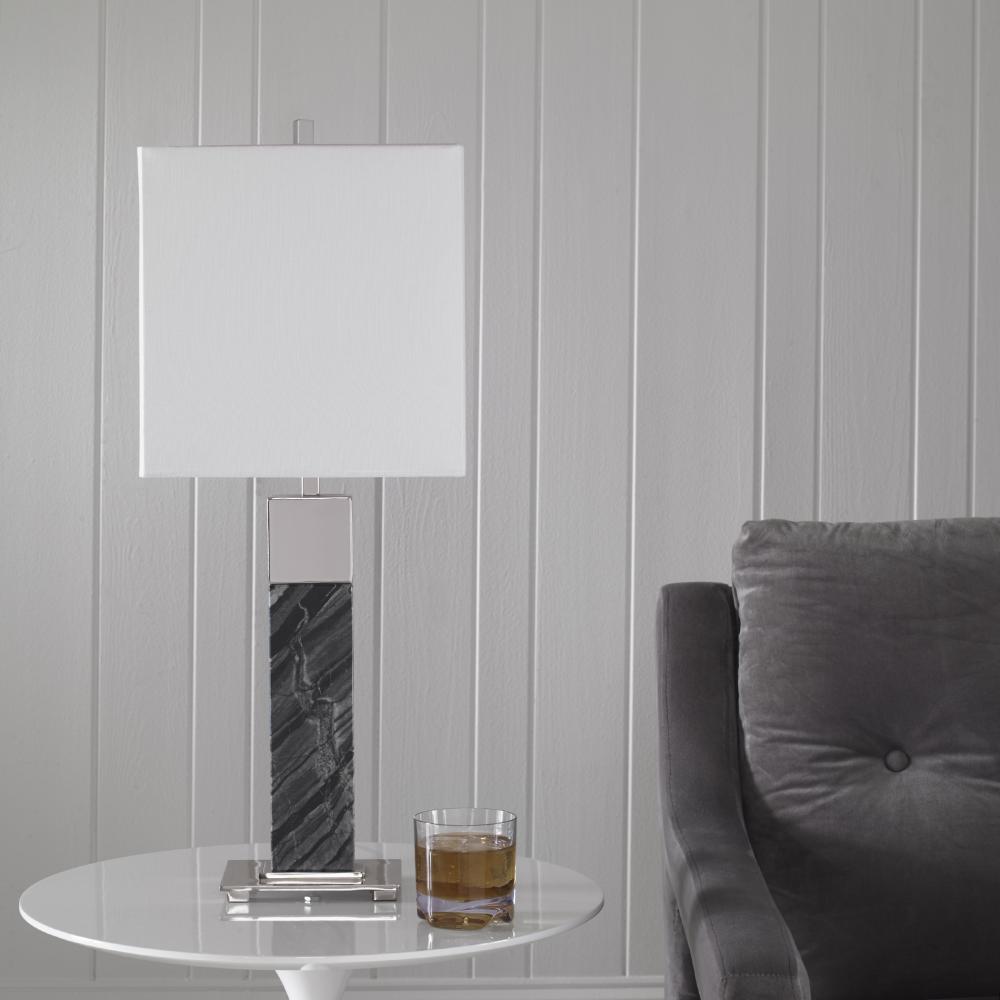 The Perfect Blend of Classic and Contemporary Looks, This Table Lamp Displays An Elegant Natural Black Marble Column with Gray and White Veining Accented By Polished Nickel Plated Finishes. The Hardback Square Shade is Covered in A Crisp White Linen Fabric.