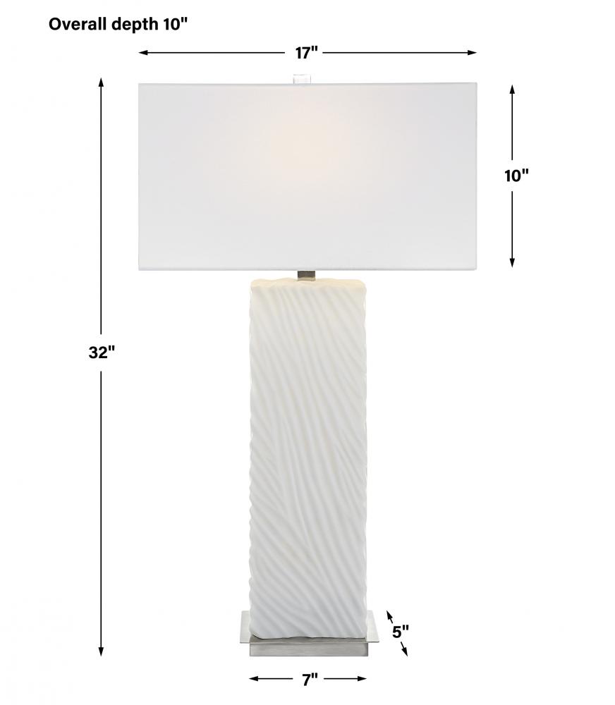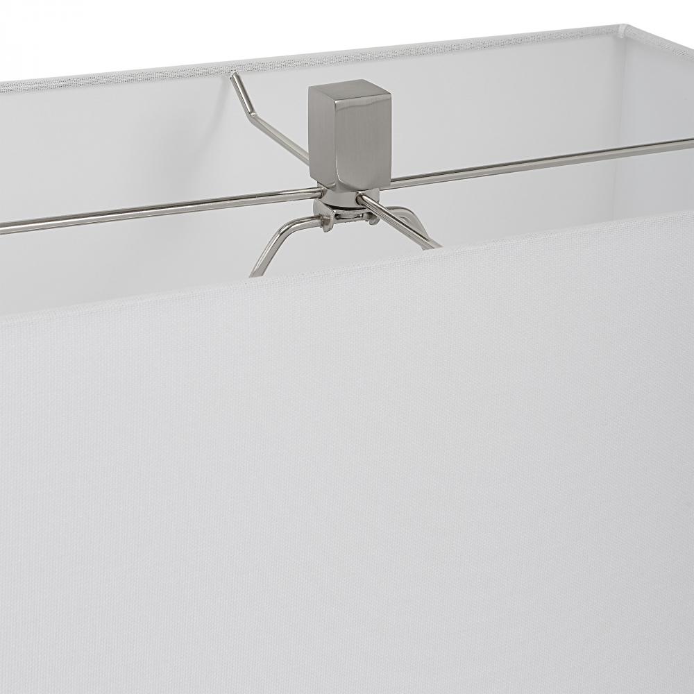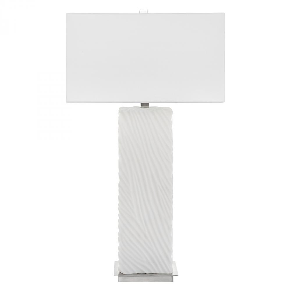 Stylish and Sophisticated, This Table Lamp is Executed in A Rich Carved Ivory Man-made Stone That Accurately Replicates The Look of Thassos Marble and is Accented By Brushed Nickel Finished Iron Details. A Rectangle Hardback Shade in White Linen Complements The Design.