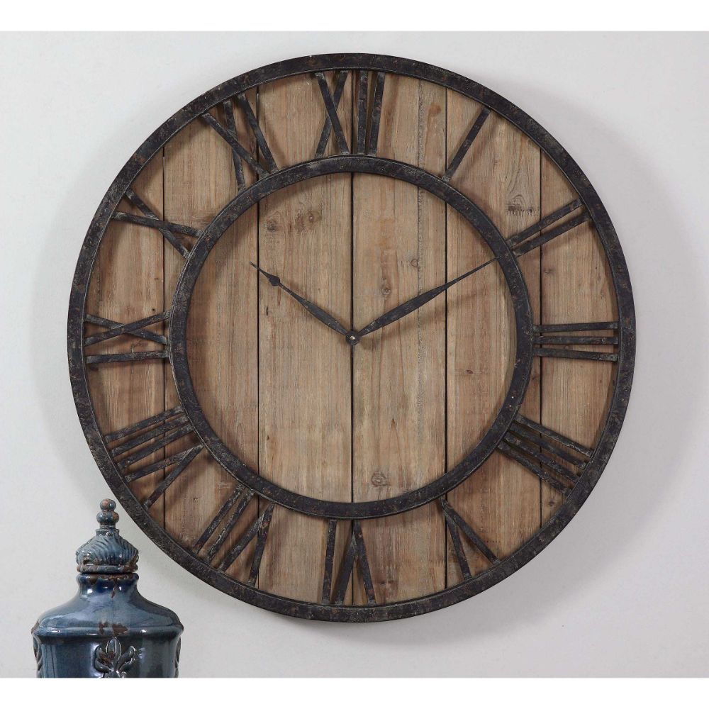 Wall Clock with Aged Wood Panels Accented By Rustic Dark Bronze Metal Details and Gold Highlights. Quartz Movement Ensures Accurate Timekeeping. Requires One "AA" Battery.