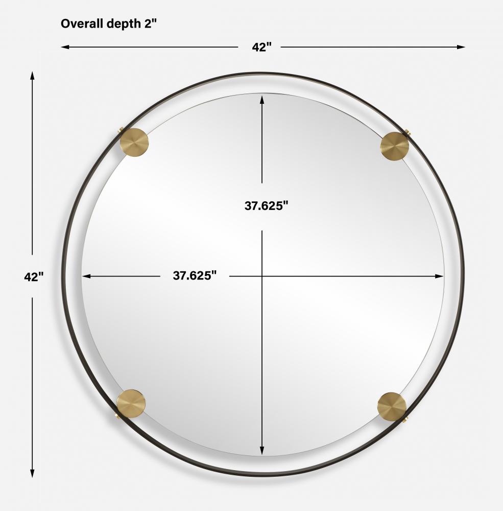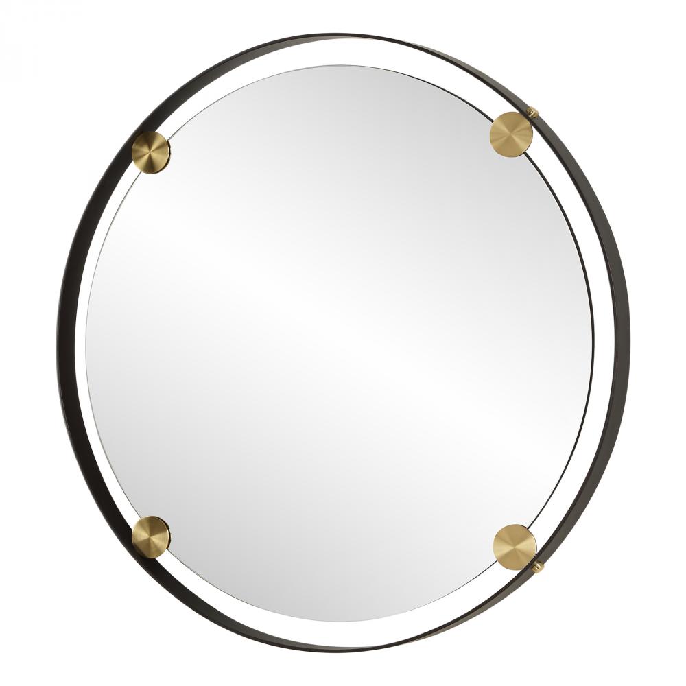 This Round Mirror Features A Hefty Dark Bronze Iron Frame That Exudes Contemporary Charm, While Plated Brass Medallions Add A Touch Of Traditional Elegance. Suspended Within This Exquisite Frame Is A Polished Edge Mirror, Reflecting A Blend Of Sophistication And Functionality.