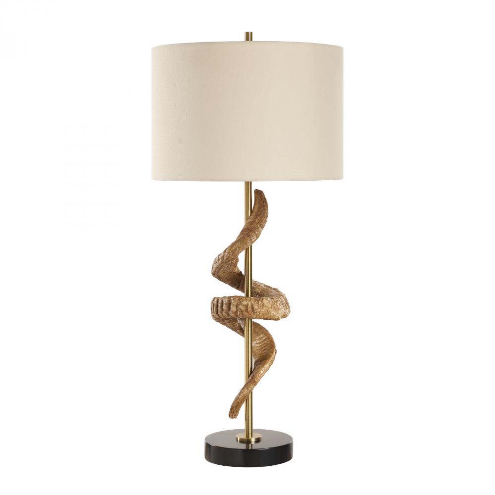 This Eye-catching Table Lamp Showcases A Sculpture Inspired By A Rams Horn Displayed Around A Plated Antique Brass Column And A Thick Black Marble Foot. A Round Hardback Drum Shade Made With An Off-white Linen Fabric Completes The Piece.