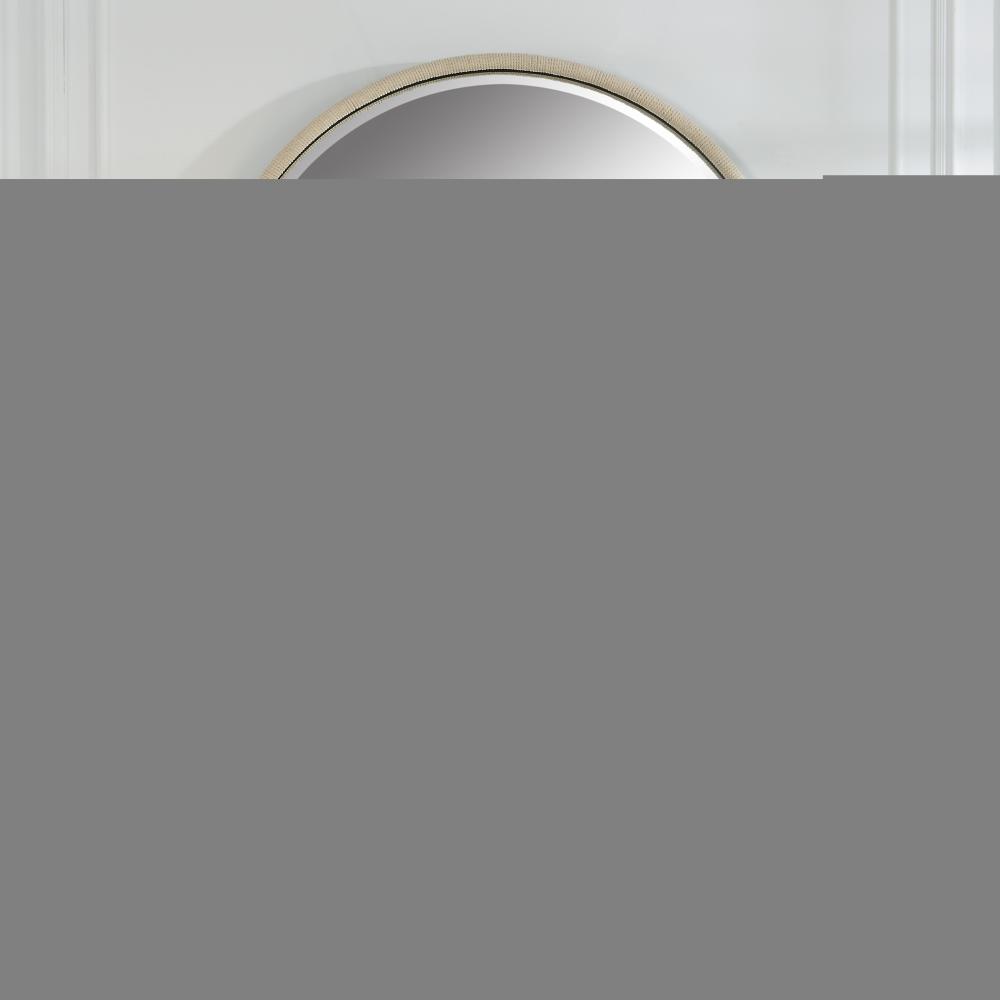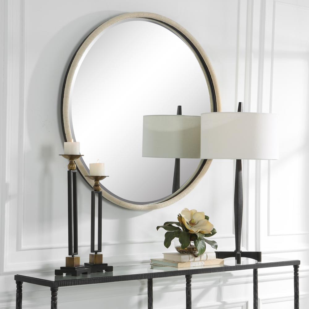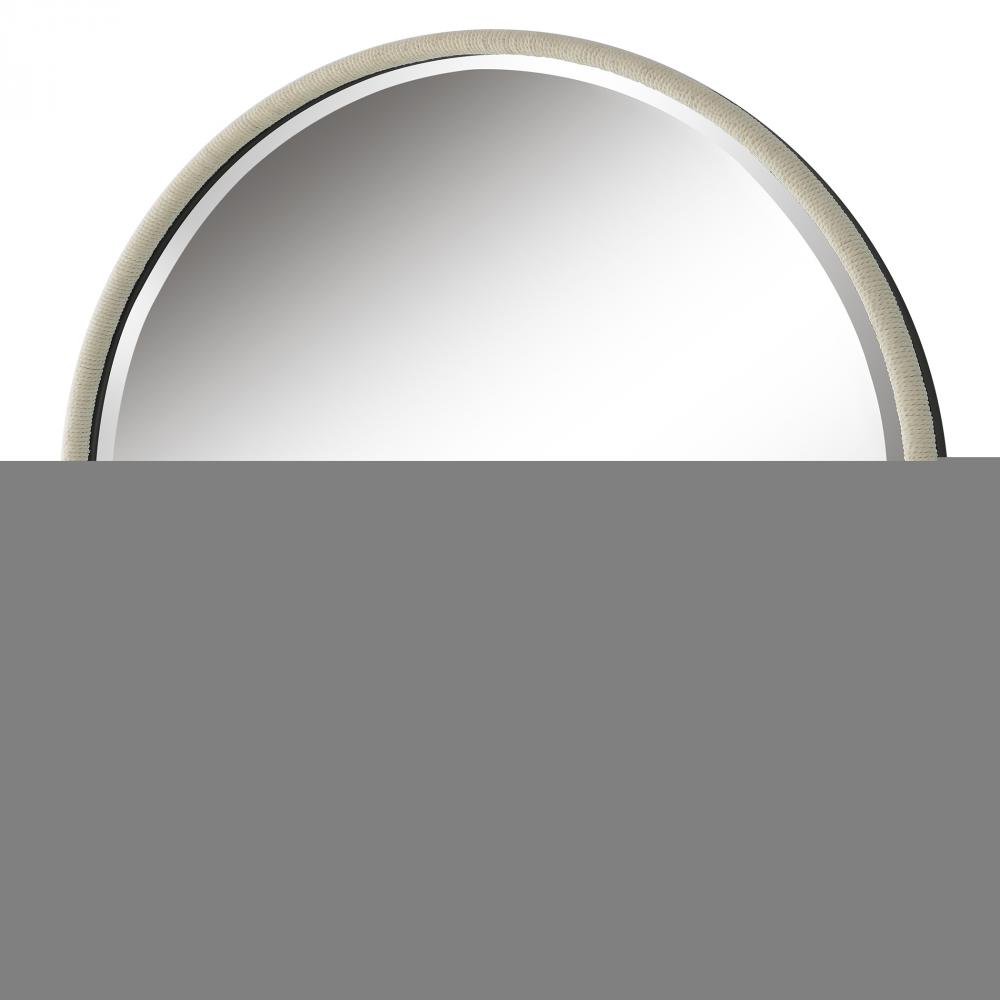 The Ranchero Round Mirror Adds An Updated Coastal Flair with A Black Iron Frame Featuring A Rounded Profile Wrapped in White Braided Rope. Mirror Has A 1 1/4" Bevel.
