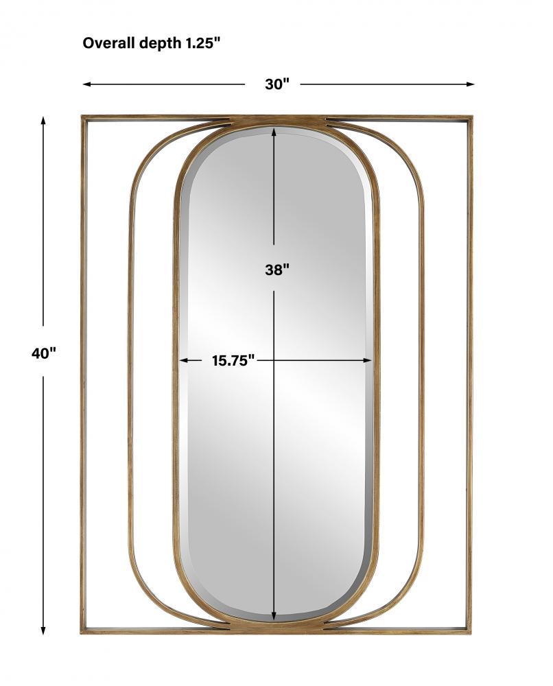 Contemporary Style Mirror Displays A Beveled Oval Interior with An Angular Metal Framework Finished in A Heavily Antiqued Gold. Hung Vertical Only.