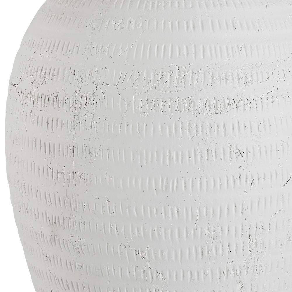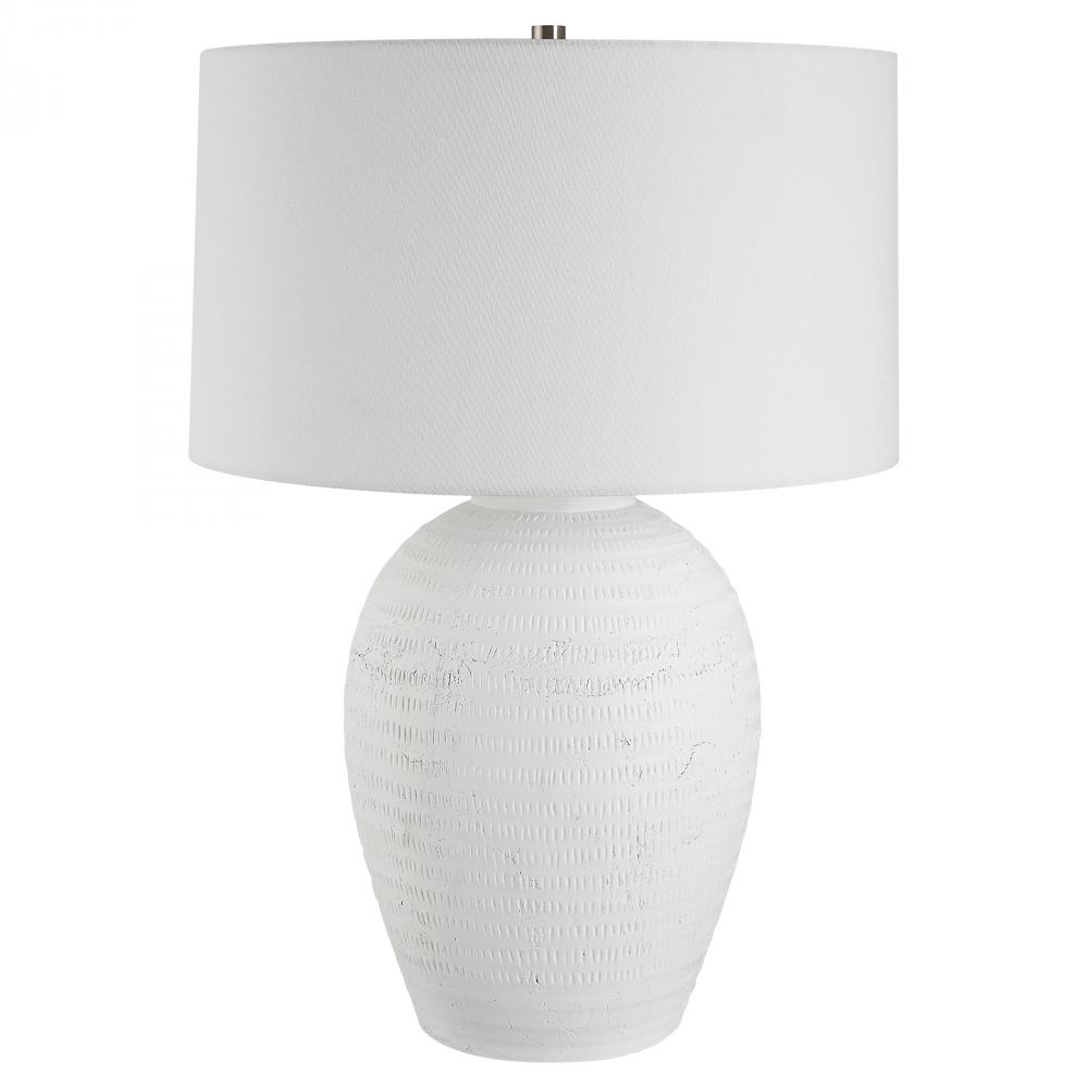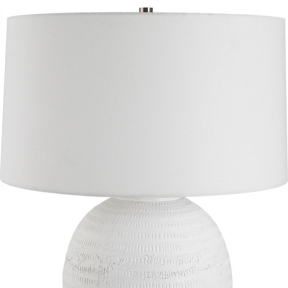 This Ceramic Table Lamp Features A Timeless Urn Shape Finished in A Chalk White Glaze with Updated Hand Carved Texture and Subtle Distressing, Accented with Brushed Nickel Details. The Slightly Tapered Large Round Shade is Made in A Casual White Linen Fabric.