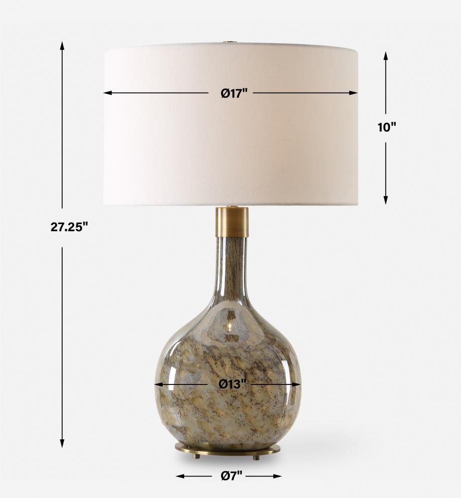 The Rhine Table Lamp Showcases A Seeded Glass Body In Warm Tones Of Light And Dark Browns Paired With Smoke Gray, Accented With Plated Antique Brass Details. The Round Hardback Drum Shade Is A Crisp White Linen Fabric.