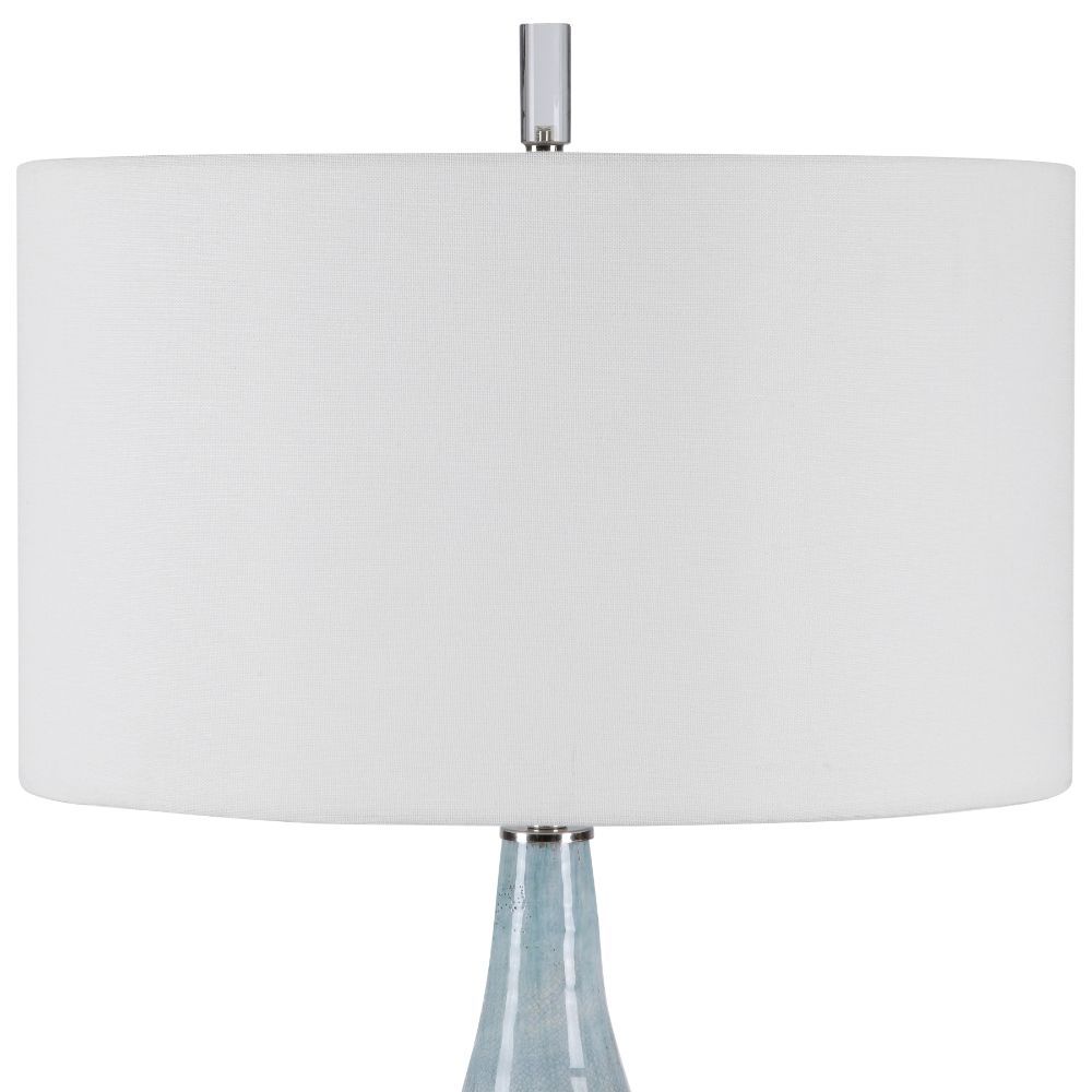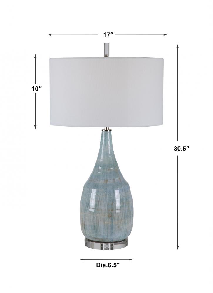 Showcasing A Refined Coastal Style, This Table Lamp Has A Ceramic Base Finished in An Aqua and Teal Crackle Glaze with Touches of Rust Brown. Polished Nickel and Crystal Accents Highlight The Design. The Lamp is Paired with A Round Hardback Drum Shade in A White Linen Fabric.