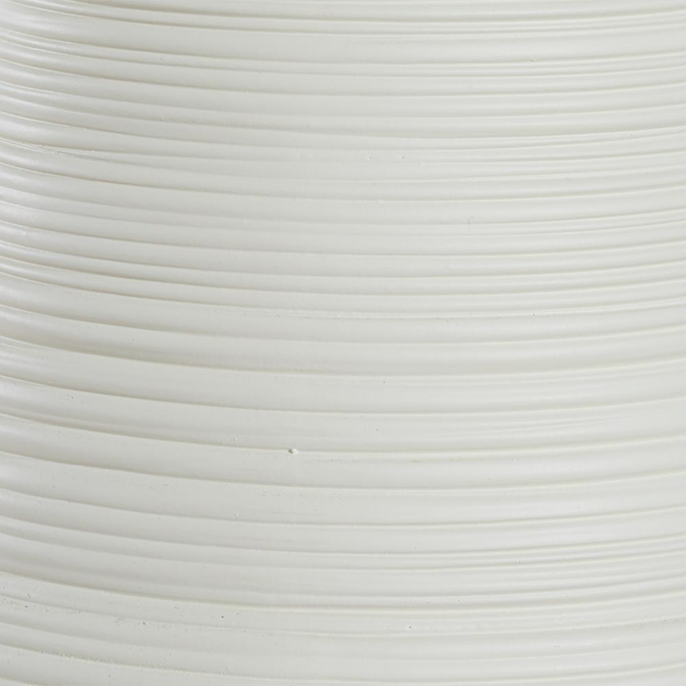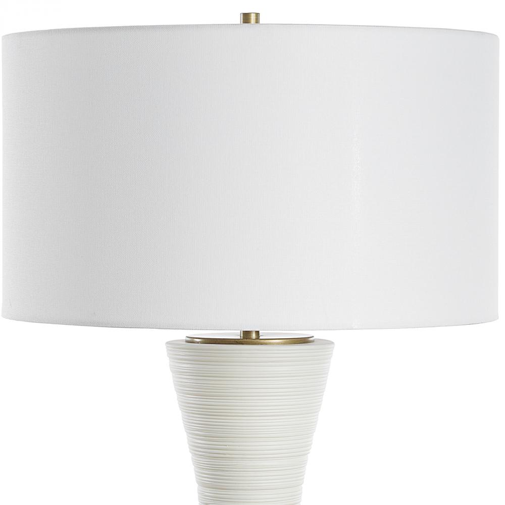 This Ceramic Table Lamp Boast A Warm White Matte Finish With Horizontal Ridge Lines, Adding A Touch Of Texture And Visual Interest To Sleek Curves, Paired With Plated Antique Brass Details. A Round Hardback Drum Shade Finished In A Casual White Linen Fabric Completes The Piece.