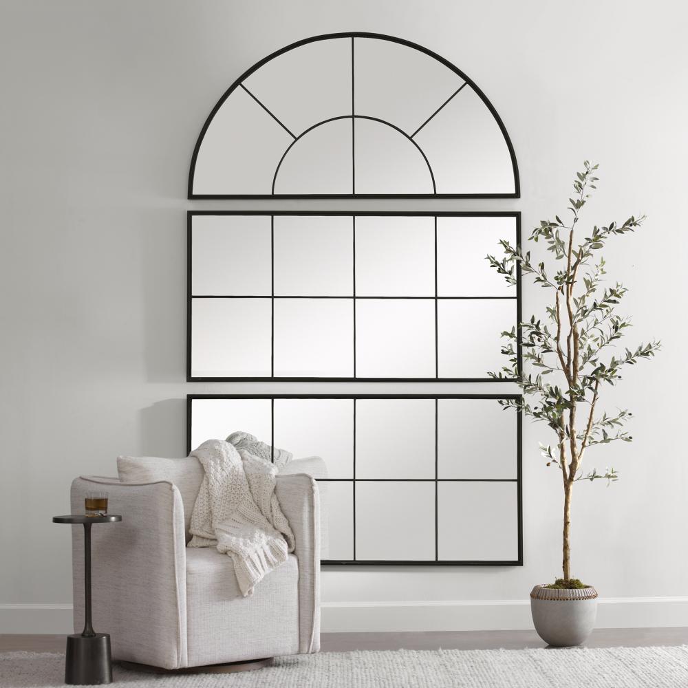 Inspired By Old Warehouse Windows, This Mirror Showcases A Heavy Iron Frame with Deep Channels Finished in Wrought-iron Black. May Be Hung Horizontal or Vertical.