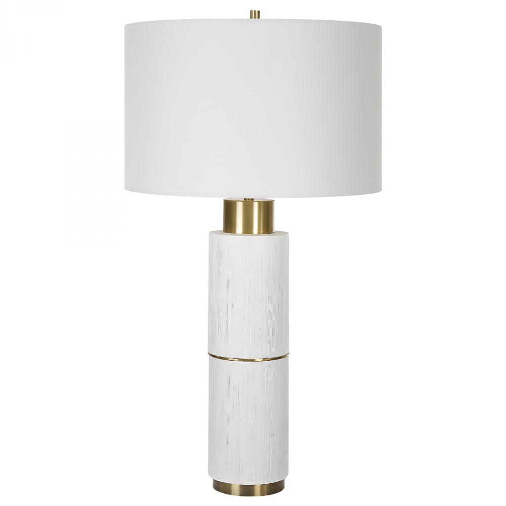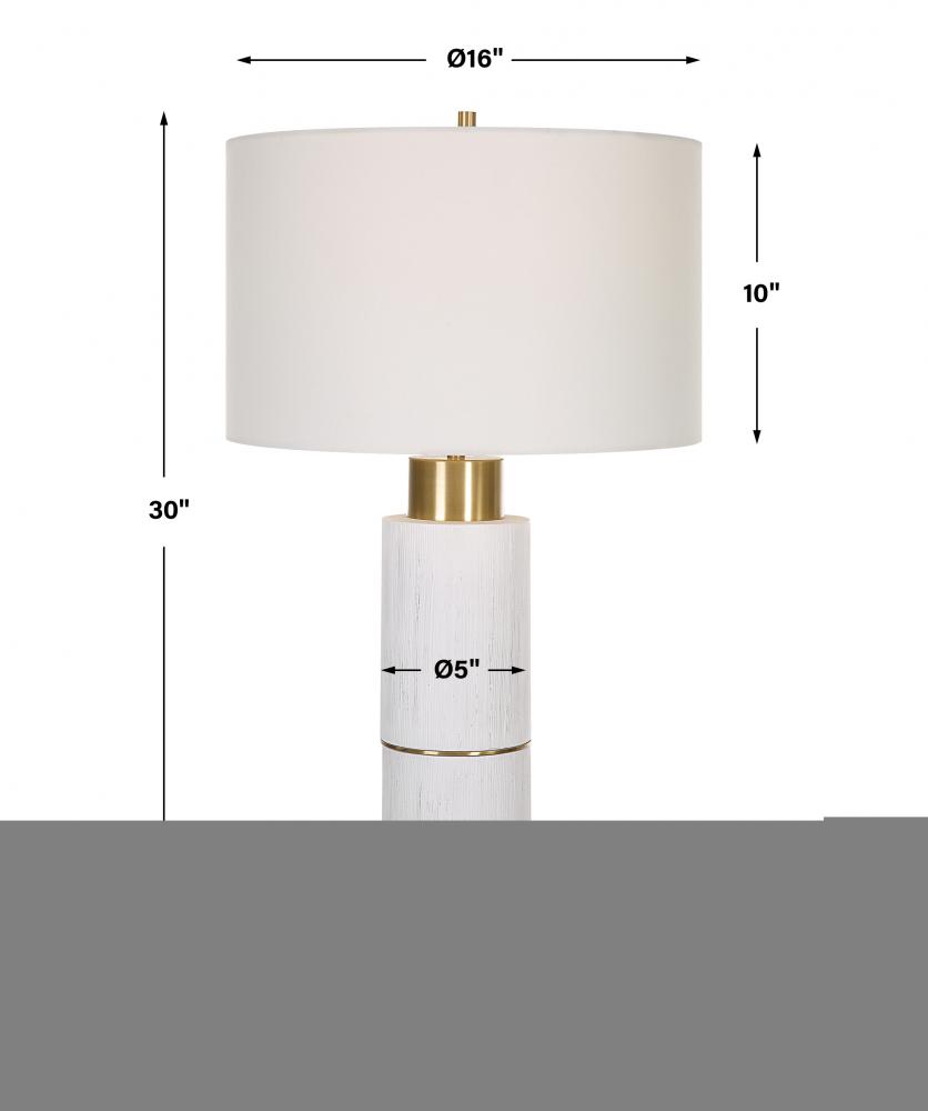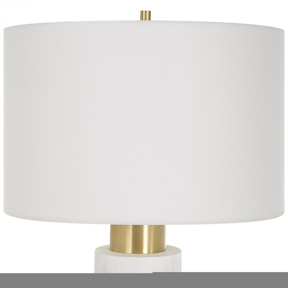 The Ruse Table Lamp Showcases A Whitewashed Wood Look with A Noticeable Textured Finish, Accented By Brushed Brass Plated Iron Details. Paired with A Hardback Drum Shade in A White Linen Fabric.