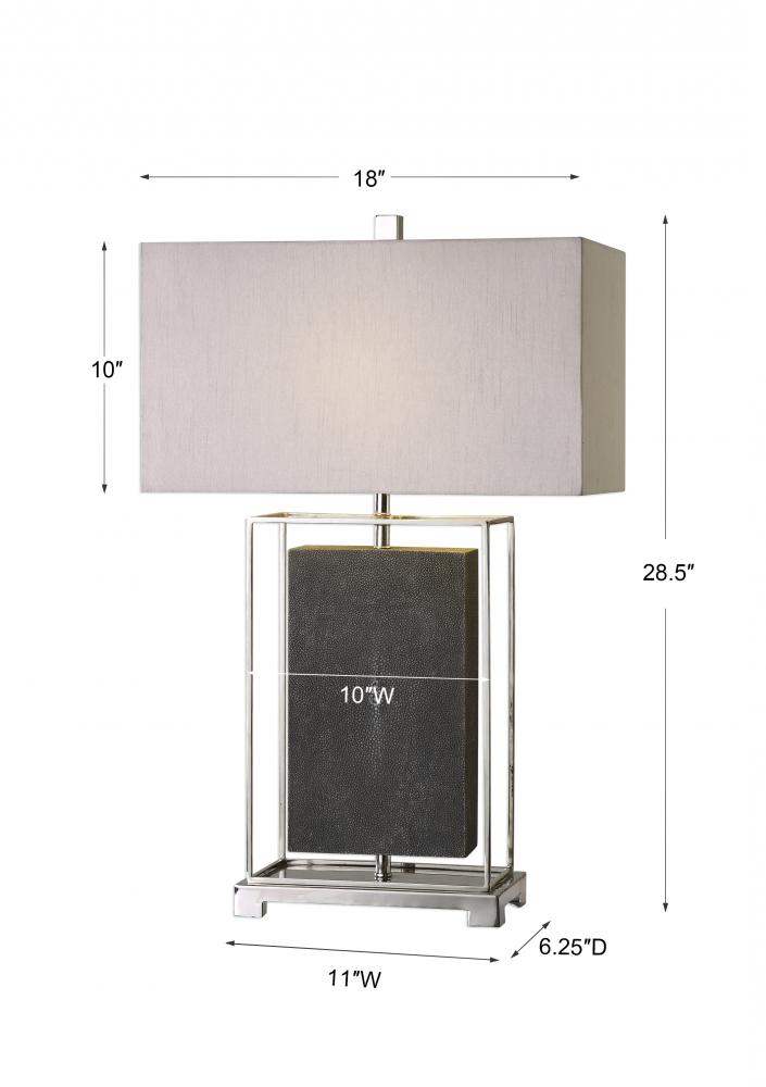 The Suspended Rectangle Base Features A Rubbed Gray Faux Shagreen Texture, Surrounded By Polished Nickel Plated Details. The Rectangle Hardback Shade is A Warm Light Gray Linen Fabric.