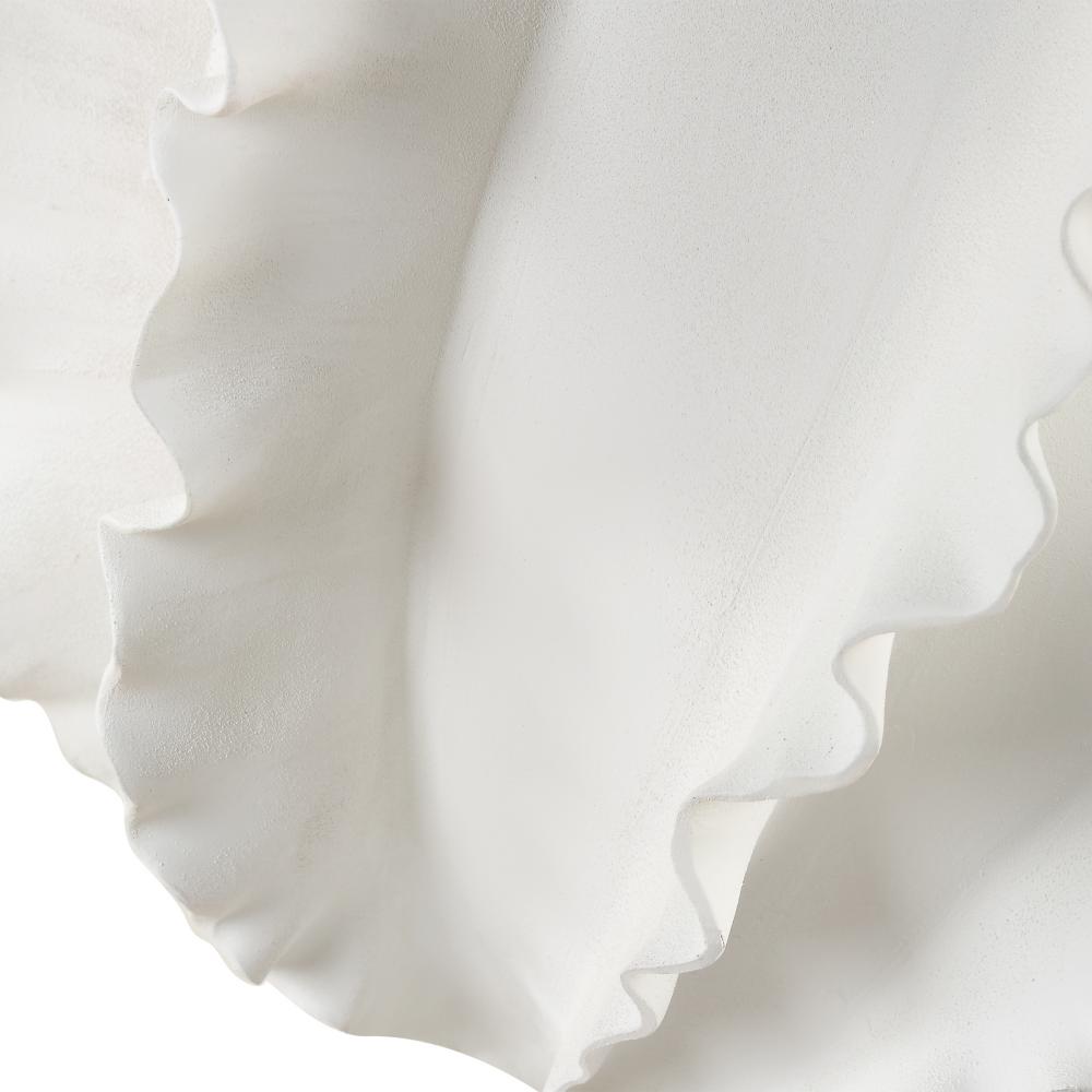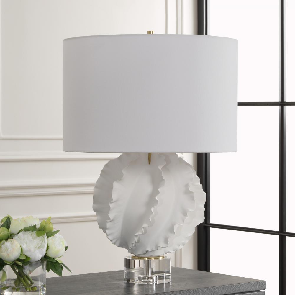 This Ceramic Table Lamp Is Finished In A Satin White Glaze Featuring Gracefully Flowing Deep Ridges, Accented With Brass Plated Details And A Thick Crystal Foot. The Round Drum Shade Is Covered In A Crisp White Linen Fabric.