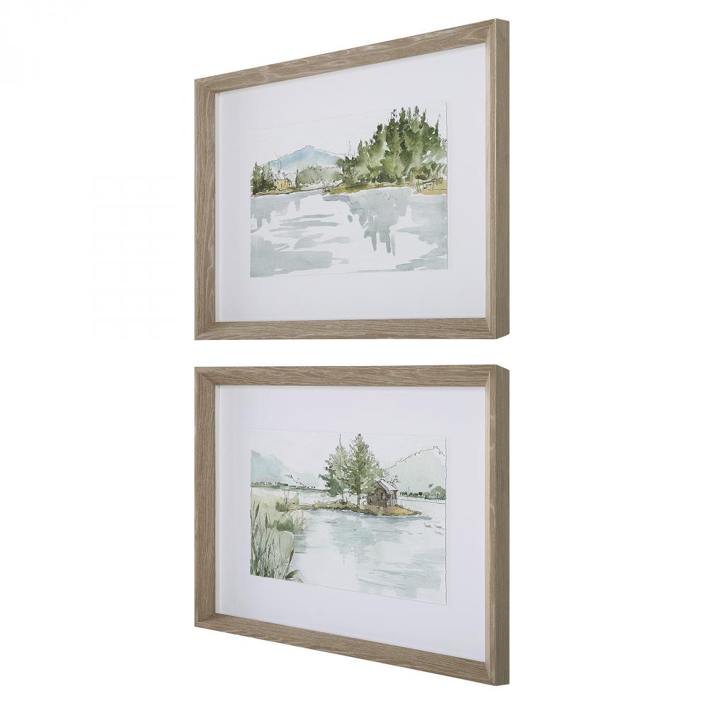 Inspired By Serene Lake Views, These Watercolor-style Sketches Display Tranquil Shades of Smokey Blues, Olive Greens, and Mustard Yellows. Each Landscape is Accented By A White Background and An Gray Washed Pine Frame Under Glass. Artwork By Anne Tavoletti.