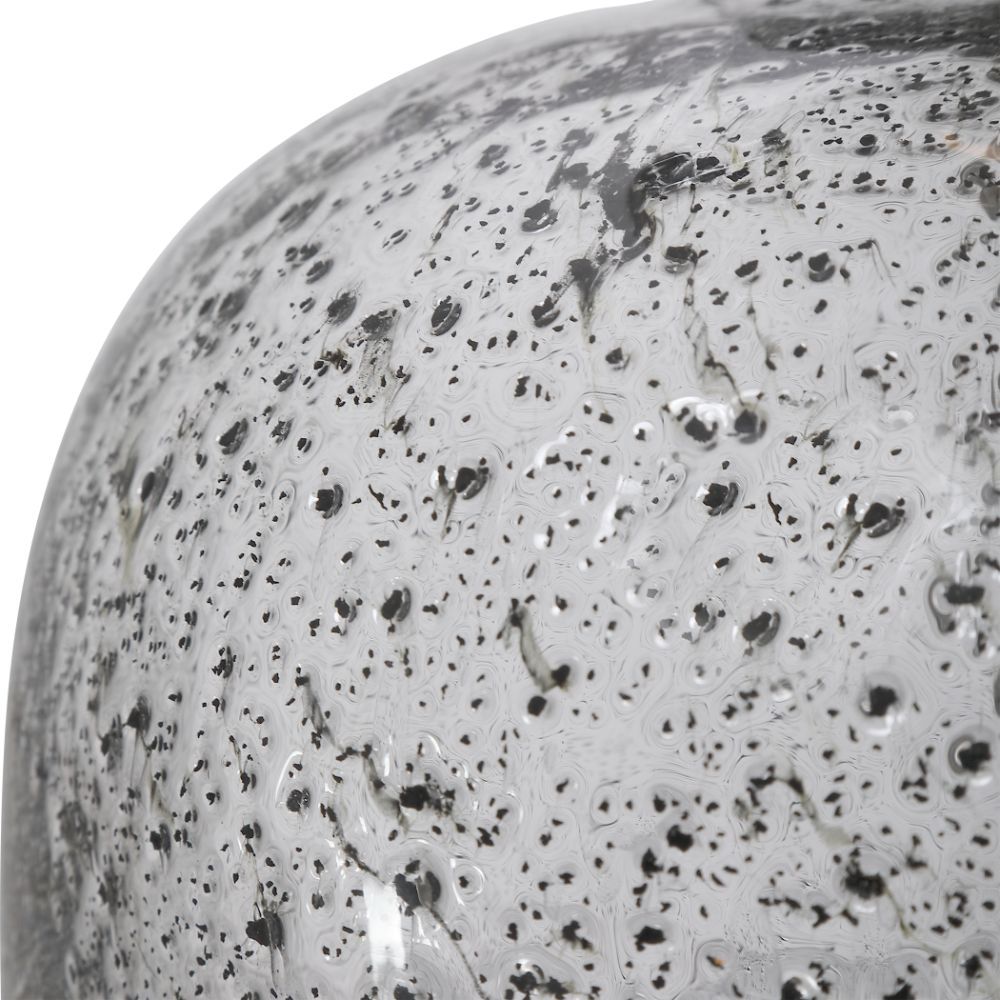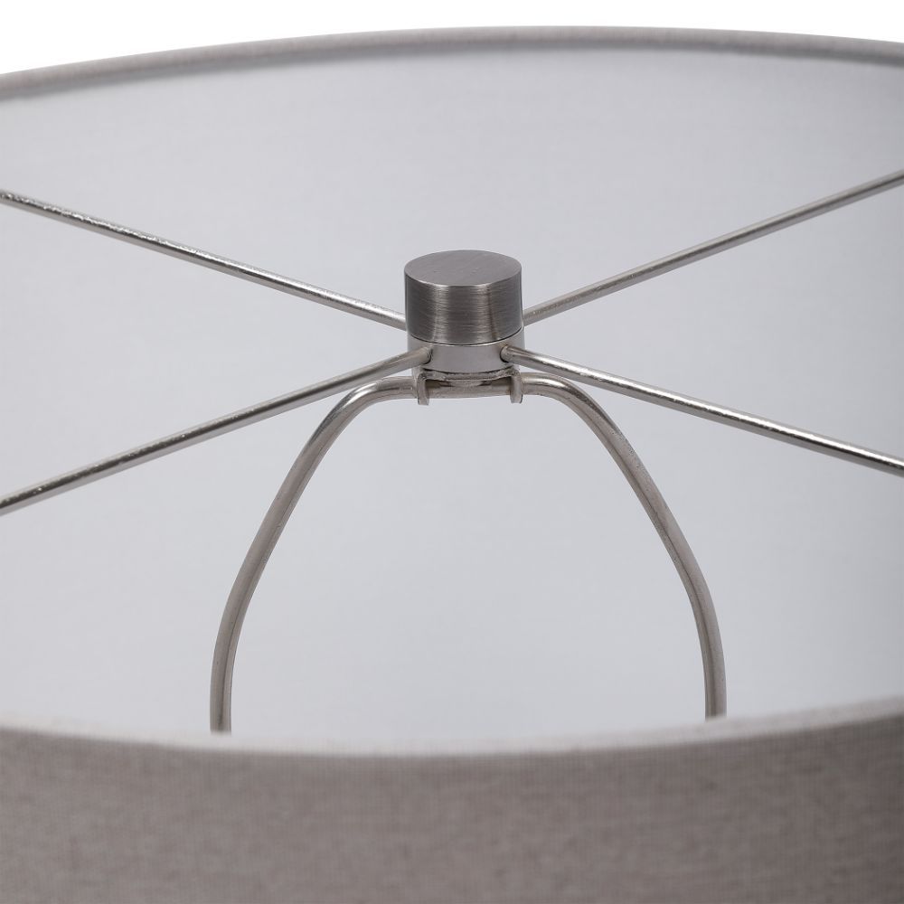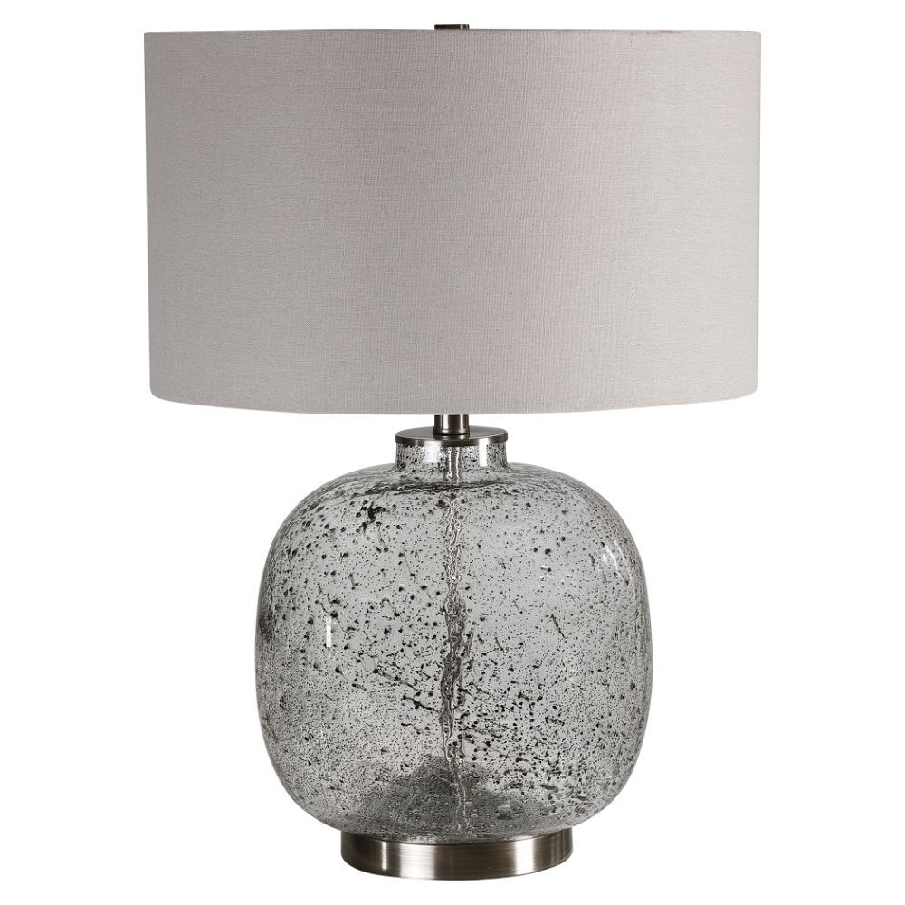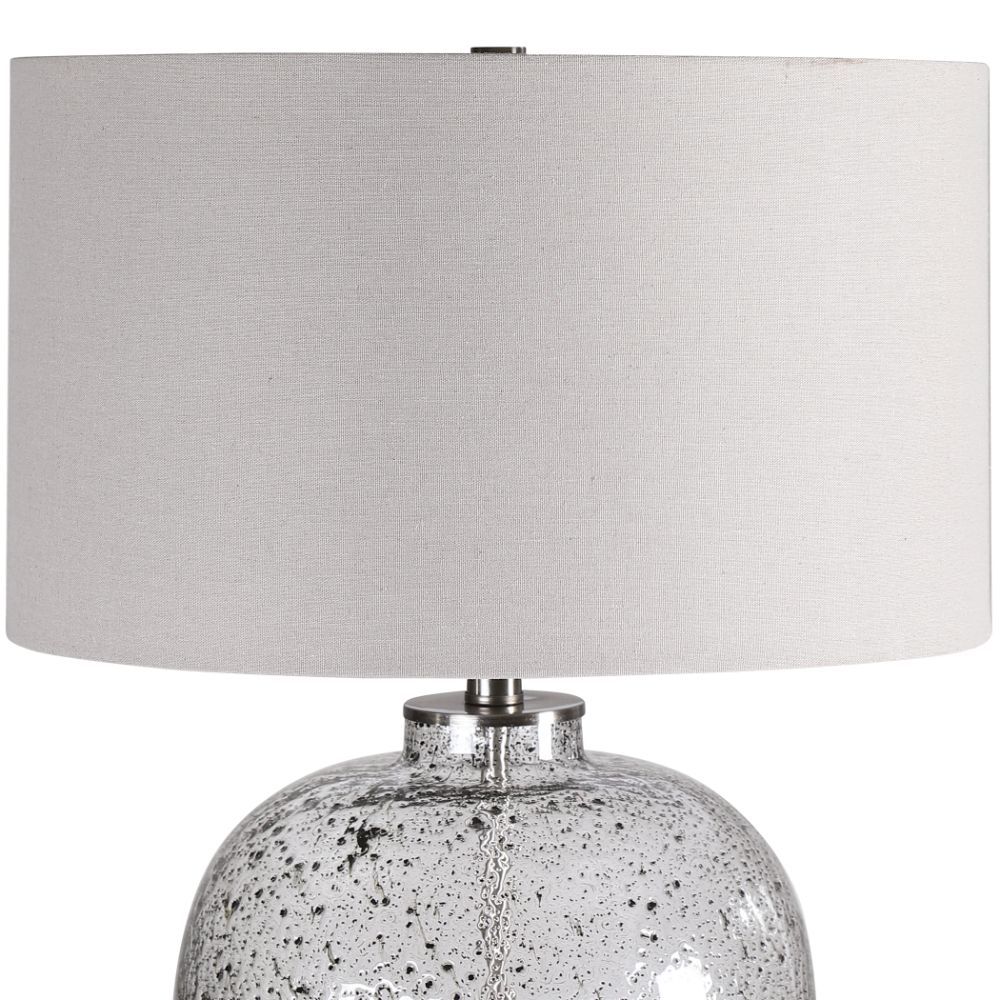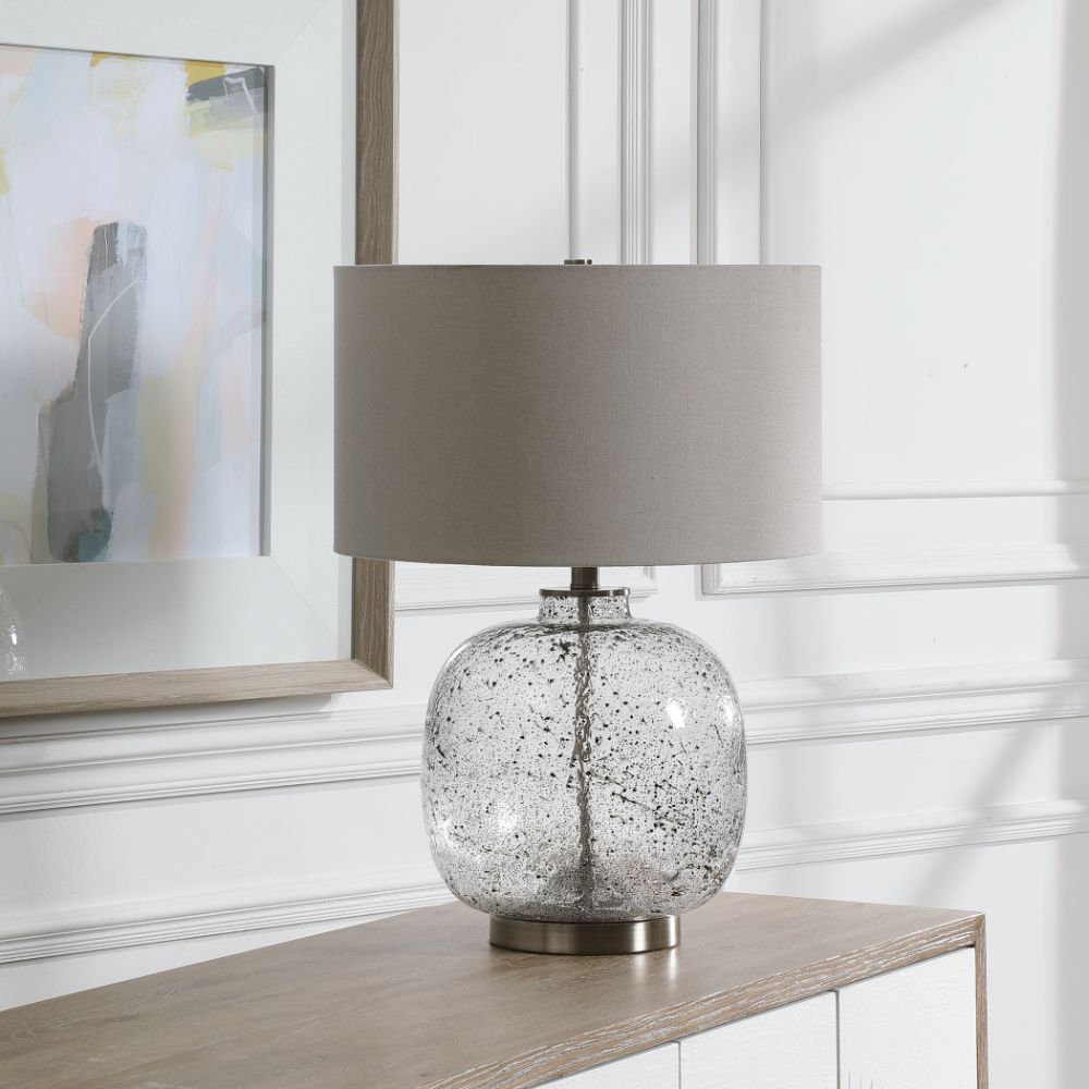 Modern Style Table Lamp Features A Translucent Art Glass Base with Abstract Black Flecks Throughout, Accented with Brushed Nickel Details. The Round Hardback Drum Shade is A Light Gray Linen Fabric with Natural Slubbing.