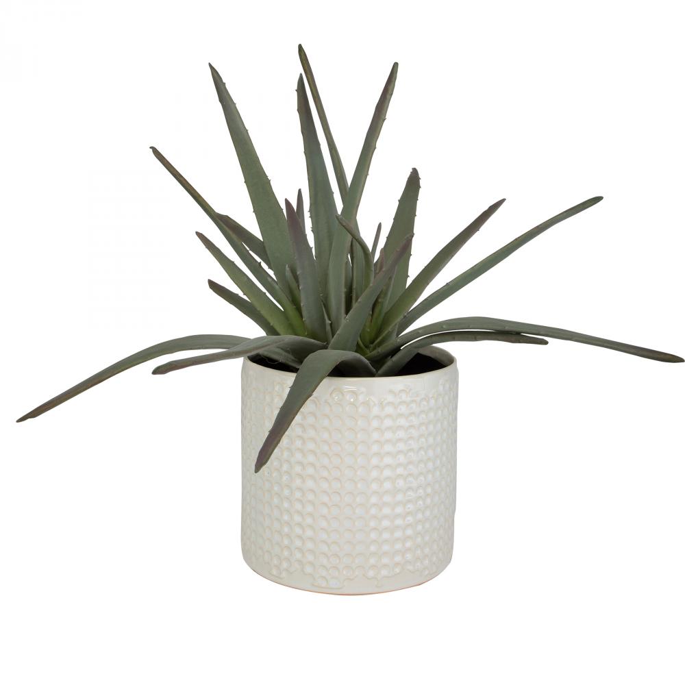 A Statement Making Cluster of Aloe Potted in A Dimpled Ceramic Container and Glazed in Ivory with Beige Undertones.