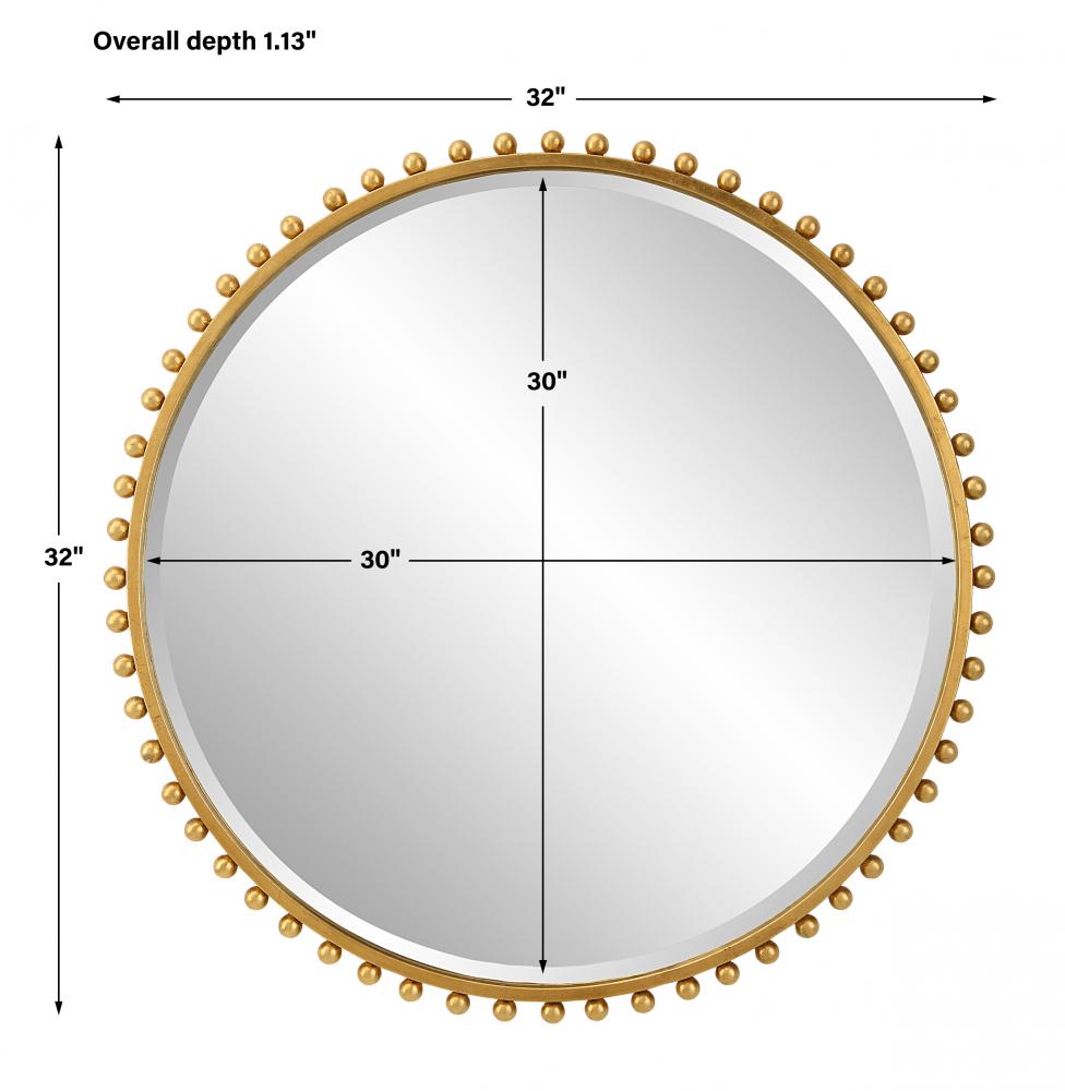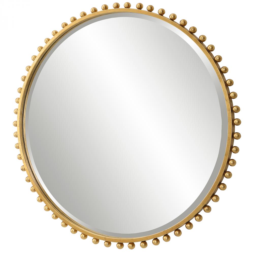 Petite Iron Spheres Line The Outer Edge of This Round Frame, Finished in A Timeless Gold Leaf. Mirror Features A Generous 1 1/4" Bevel.