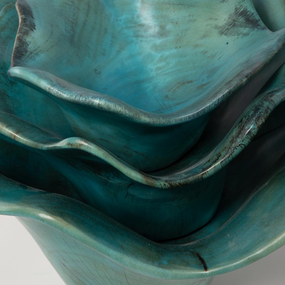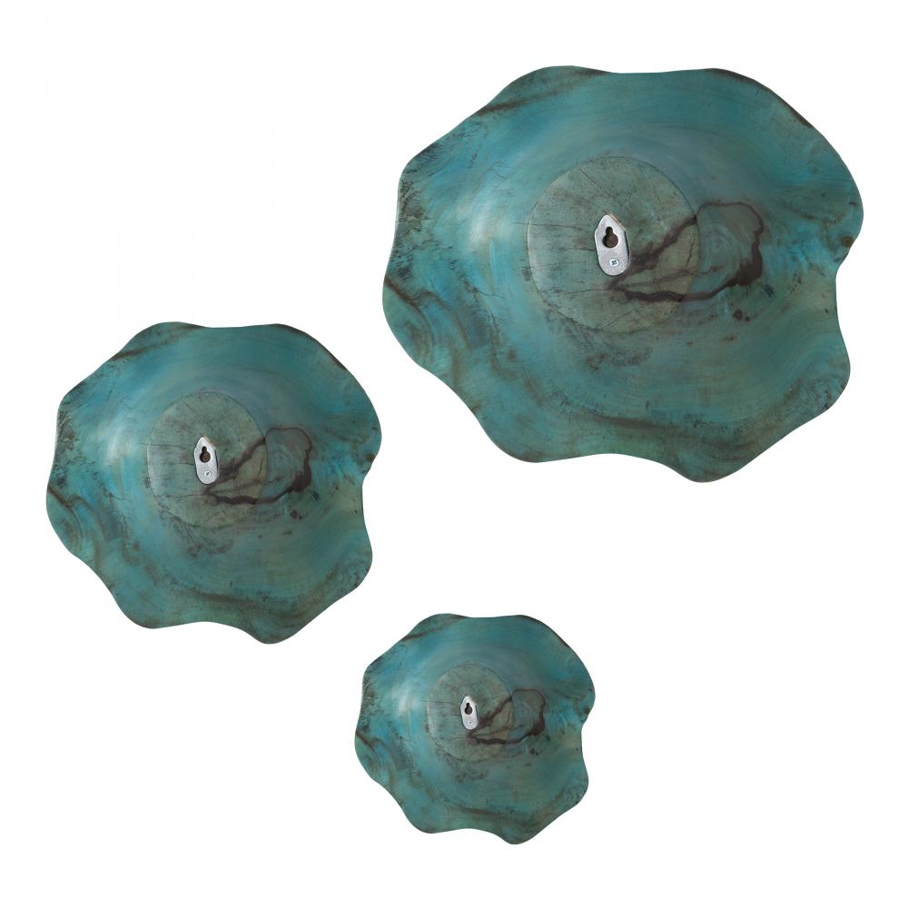 This Set of Three Wood Wall Art Features Naturally Spalted Tamarind Wood, Finished in A Soft Blue-green. Because Each is Individually Handcrafted, Sizes May Vary. Cracks and Variations in The Grain Are Natural to This Type of Wood. May Be Hung on A Wall with Keyhole Hangers, or Displayed As Tabletop Accessories. Sizes: Sm-10x10x5, Med-15x15x7, Lg-16x16x7