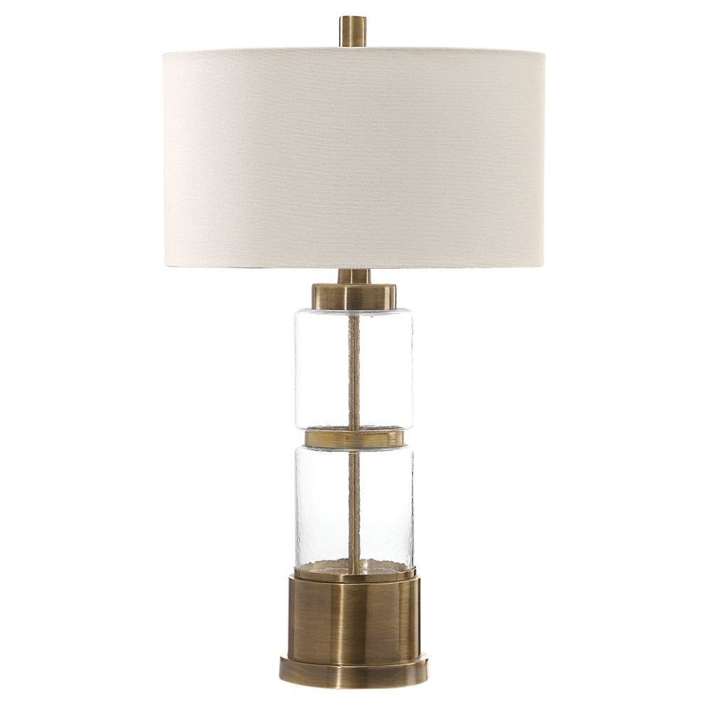 Stacked Clear Glass Columns with A Hammered Texture, Displayed with Antique Brass Plated Steel Details. The Round Hardback Drum Shade is A White Linen Fabric with White Slubbing.
