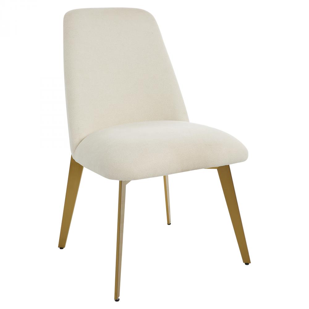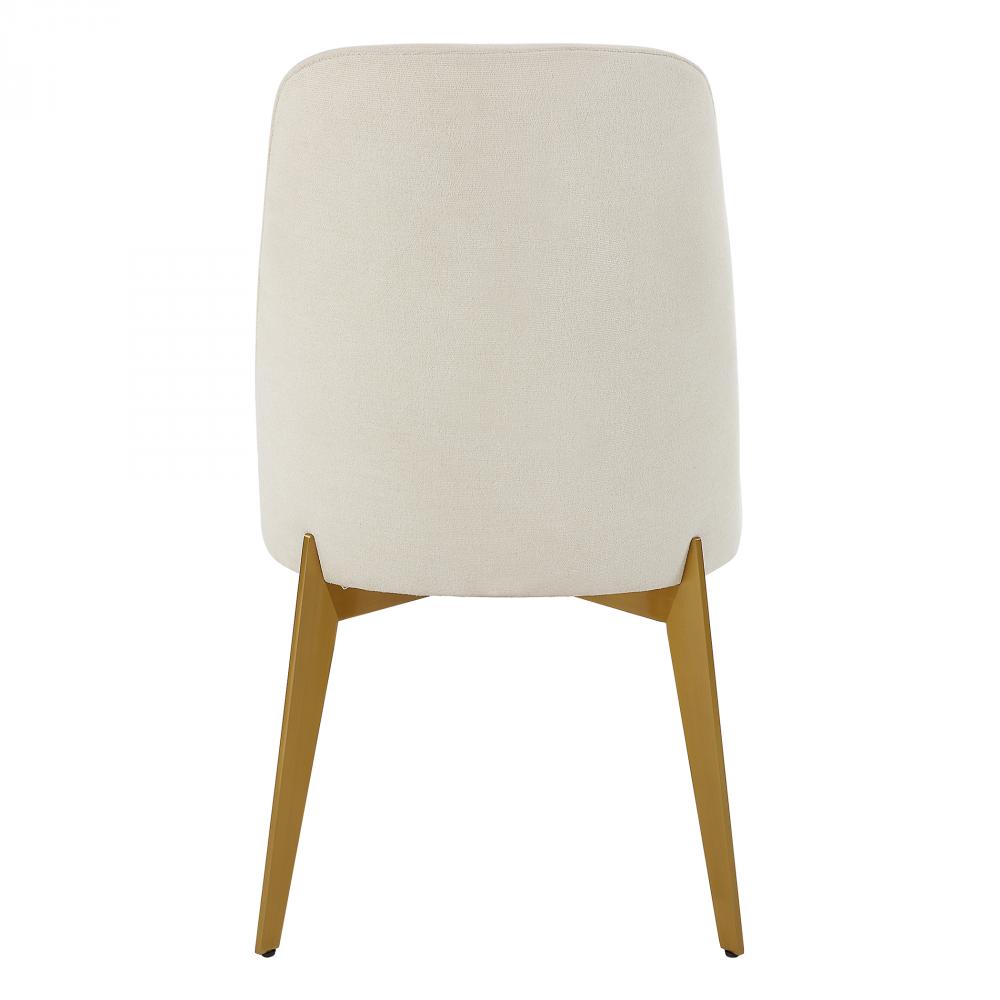 Featuring A Brushed Brass Stainless Steel Base That Encapsulates The Plush Seat Upholstered in A Frost Toned Polyester Fabric with Added Performance Treatment.
